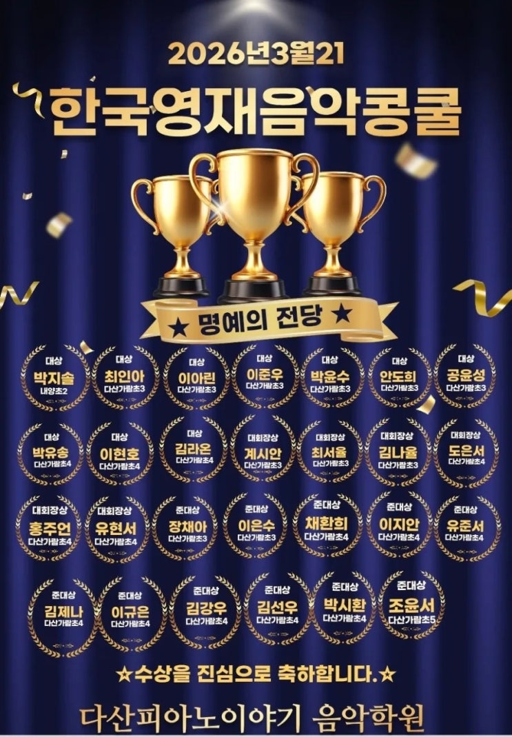 결과보다 더 값진 ‘무대 경험’ 많은 학부모님들께서 “콩쿨은 꼭 나가야 하나요?”라고 질문하십니다. 저희의 답은 분명합니다. “무대 경험은 실력을 완성시키는 마지막 퍼즐입니다.” 아이들은 연습실에서는 잘 치던 곡도 막상 무대 위에서는 긴장과 떨림 속에서 자신의 실력을 온전히 보여주기 어려워합니다. 하지만 이러한 경험이 쌓일수록 ✔ 집중력 ✔ 표현력 ✔ 자신감 이 눈에 띄게 성장합니다. 이번 콩쿨을 통해 아이들은 단순한 ‘연주자’가 아닌 무대를 즐길 줄 아는 연주자로 한 단계 성장했습니다. 성공 뒤에 숨겨진 진짜 이야기 결과는 하루아침에 만들어지지 않습니다. 콩쿨을 준비하는 동안 아이들은 ✔ 매일 반복되는 연....... <img src="https://blogthumb.pstatic.net/MjAyNjA0MTNfMjcg/MDAxNzc2MDMwNzEyNzM4.oKur5IEWaSELZusoAHY5uvx7RfT6Ea4ZwT-dcK19ns4g.CM-LsM0flrKlxm2Jgpz31hgvHDp1H1fqrfqXZDX_gqMg.JPEG/900_1776030115792.jpg?type=s3" />