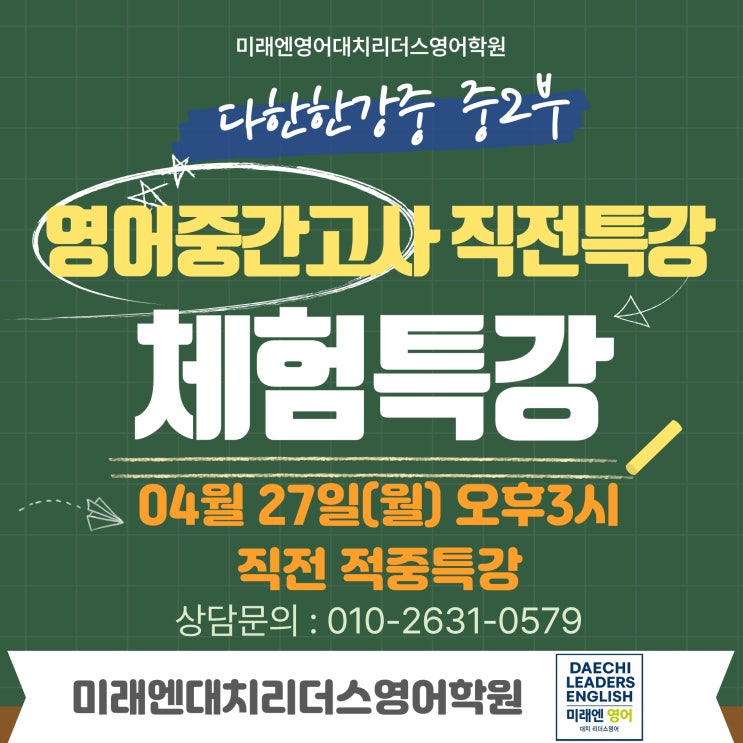 두~둥 안녕하세요. 다산한강중영어학원 미래엔대치리더스영어입니다. 이제 다산한강중 친구들 1학기 중간고사가 딱 2주밖에 남지 않았습니다. 다산한강중영어학원 미래엔대치리더스영어에서 우리 친구들은 이미 주말 특강까지 하면서, 열심히 막바지 준비를 하고 있습니다. 중2 중간고사 영어시험일은 4월 28일 화요일 !!! 이에 대비하여, 미래엔대치리더스영어학원에서는 직전적중체험특강을 진행합니다. 4월 27일 월요일 오후3시! 적중체험특강은 모든 다산한강중 중2 친구라면 누구나 참여 가능합니다. 단 한문제라도 놓치고 싶지 않다면, 이날 적중체험특강에 꼭 참여해 보세요. 다산한강중 중2 친구들의 영어 고득점을 기원합니다. 파이팅~~....... <img src="https://blogthumb.pstatic.net/MjAyNjA0MTRfMjU5/MDAxNzc2MTMyNTc0NDAw.cUJSuOi24ZMKpWazElOxAVz668WtUQ2FjfRFuoow-q4g.H1Zyw4xA19yOCqNOPw-0AXWFbgZE9rIUBkfCWNW0pP8g.JPEG/%C1%A6%B8%F1%C0%BB_%C0%D4%B7%C2%C7%D8%C1%D6%BC%BC%BF%E4._%2870%29.jpg?type=s3" />