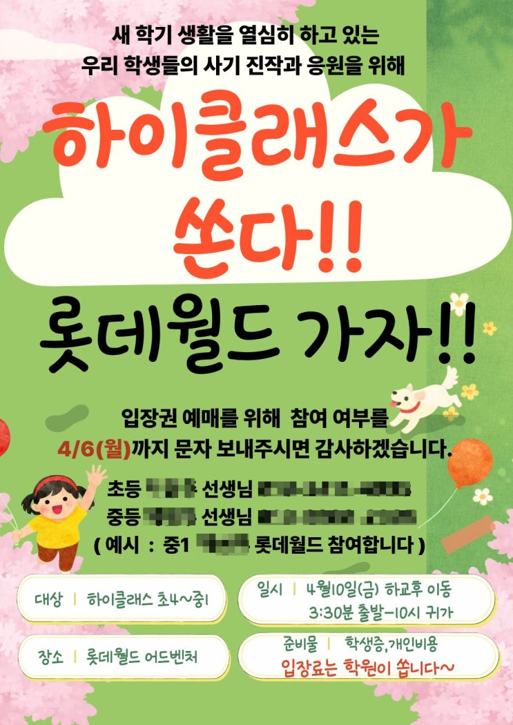 안녕하세요~하이클래스 수유점이예요~ 어제부터 비가 내려서 걱정했는데 다행히 우리 아이들 잘~~~놀라는 건지 비가 멈췄네요~ 오늘은 초등4학년부터 중1까지 도파민 팍!팍 만들어줄 롯데월드에 다녀왔어요~ 친구들 모두 기대감과 설레임에 오늘만을 기다렸다는 후문~~~ㅋㅋ 안과 밖을 오가며 신나게 놀이기구도 타고 친구들과 사진도 찰칵!!! 우리들만의 추억을 만드는중~~ 단체 사진도 찍어주는 센스~~~~ 오늘 하루 우리 아이들이 힐링되었길~~~~ 이제부터 우린~~~~^^ <img src="https://blogthumb.pstatic.net/MjAyNjA0MTNfMjg0/MDAxNzc2MDY5NDkwNTA3.YMqh8j5TVzgNfFti0qV7JXcylopRiCZzJXmFeiOeDj8g.bvN_ejr1OjQRxYJNewHGDmf869omba8FpopwEGPZVS8g.JPEG/%BC%D2%C7%B3%A4%B7.jpg?type=s3" />