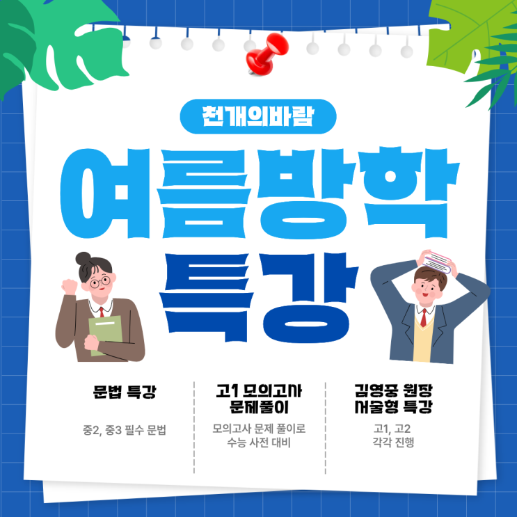안녕하세요. 남양주 영어학원 천개의바람영수학원입니다. 항상 믿고 자녀를 맡겨주시는 학부모님들께 깊이 감사드립니다. 이번 중간고사 역시 만족스러운 결과로 보답할 수 있도록 끝까지 지도하겠습니다. 먼저 안내드립니다. 이번 여름 특강은 모든 반이 예약 시작 하루만에 조기 마감되었습니다! 많은 관심과 신뢰에 진심으로 감사드립니다. 영어 여름방학 특강 안내 이번 특강은 현재 남양주 영어학원 재원생을 대상으로, 수업 중 보완이 필요하다고 판단된 핵심 영역을 집중적으로 다루기 위해 개설되었습니다. 김영중 원장이 직접 진행하며, 정원을 제한하여 밀도 있는 관리에 초점을 두었습니다. ✔ 정원 안내 문법/모의고사 특강 : 15명 정....... <img src="https://blogthumb.pstatic.net/MjAyNjA0MTVfMTQ3/MDAxNzc2MjMyMDI3ODgw.9Hg1kzdJtfCQ4VG2IMQ2YVAdLTMdN8EwSr7LH0NAI8gg.Y850ajOUv1TNQYgBatfYmzimqelA_RGRONau7tkMtIMg.PNG/%C1%A6%B8%F1%C0%BB_%C0%D4%B7%C2%C7%D8%C1%D6%BC%BC%BF%E4._%285%29.png?type=s3" />