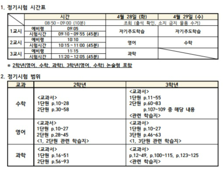 안녕하세요. 수학연주입니다. 벚꽃이 예쁘게 피는 걸 보니 중간고사 기간이 다가왔더라구요. 이번 학기 중간고사에는 국어가 빠지고, 수학/영어/과학 3과목만 본다고 하네요. 우리 아이들 공부 어쩌려고ㅜㅜ 자꾸 줄여만 줄까요.... (고등가서 고생할까봐 걱정스러운 애미마음...ㅜㅜ) 2학년 논술형 20점 / 3학년 15점 있습니다! 우리 아이들 준비 잘 해서 모두 모두 좋은 결과가 있길 바랍니다!!! 참고로 점수 반영비율입니다. 수행의 중요성 기억하세요~ <2학년> 지필평가 : 중간 35점/ 기말 35점/ 수행평가 30점 <3학년> 지필평가 : 중간 30점/ 기말 30점/ 수행평가 40점(15점+25점) <img src="https://blogthumb.pstatic.net/MjAyNjA0MTFfMTcz/MDAxNzc1OTA1Mzk0NzA3.0vO8embrnpKUuMjYHwEUt1O1d7YPxiDoFnbyGeaIBJgg.Jf6GZNqSSId7p4DNmpB4lzVS_WkhDp0JZ6cmpe-WA-4g.PNG/image.png?type=s3" />