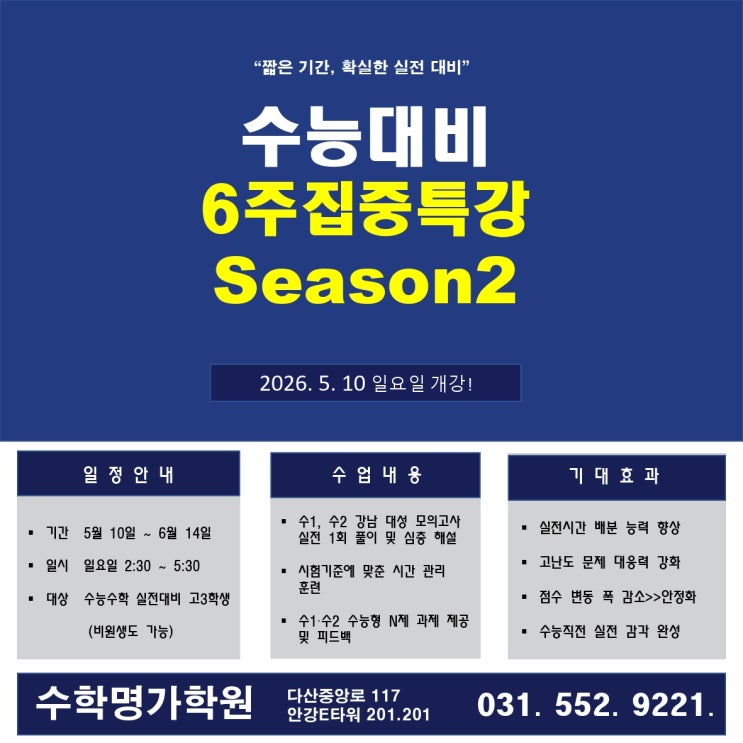 안녕하세요 수학명가학원입니다 이런 고민, 있으신가요? 문제는 많이 풀었는데 성적이 정체된 경우 시험만 보면 점수가 떨어지는 경우 고난도 문제에서 자주 막히는 경우 ▶▶ 실전 적용 훈련 부족이 원인입니다 이번 특강의 목표는 명확합니다. 실전 시험 대응력 강화 고난도 문제 해결력 향상 안정적인 점수확보 ▶▶ "점수로 연결되는 수업"이 포인트 수업구성은 어떻게 ? 강남 대성 모의고사 실전 1회 진행 풀이 및 심층해설 수1,수2 전범위 적용 훈련 시험기준에 맞춘 시간관리 훈련 수1, 수2 N제 과제 제공 및 피드백 ▶▶실전⇒분석⇒보완⇒반복 구조 기대효과 실전시간 배분능력 향상 고난도 문제 대응력 강화 점수 변동 폭 감....... <img src="https://blogthumb.pstatic.net/MjAyNjA0MjFfMjAy/MDAxNzc2NzY3NTMzMzYz.vlLqhfIsOeU1xnG8npvttjgeMVNhB_ypH42TbmdkF-og.n7ORxhYapGRLtq7a9MYe1M0PnSBSth1UD9tmyNEKDK0g.JPEG/%B0%ED3_6%C1%D6%C6%AF%B0%AD_page-0001.jpg?type=s3" />