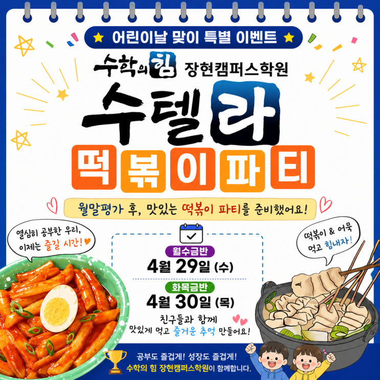 수학의 힘 장현캠퍼스학원 “수텔라 떡볶이 파티” OPEN! 안녕하세요 수학의 힘 장현캠퍼스학원입니다. 따뜻한 봄과 함께 아이들이 가장 기다리는 날, 어린이날이 다가오고 있습니다 저희 학원에서는 아이들에게 즐거운 추억을 만들어주고자 특별한 이벤트를 준비했습니다! 월말평가 후, 특별한 시간이 시작됩니다! 우리 아이들은 매달 진행되는 월말평가를 통해 한 달 동안 배운 내용을 점검하며 차근차근 실력을 쌓아가고 있습니다. 이번에도 열심히 준비하고 있는 만큼, 시험이 끝난 후에는… 맛있는 보상 시간! ✨ **“수텔라 떡볶이 파티”**가 진행될 예정입니다 ️ 아이들이 가장 좋아하는 메뉴로 준비했어....... <img src="https://blogthumb.pstatic.net/MjAyNjA0MjhfMjEg/MDAxNzc3MzUzOTU5NDY1.Si2FhPPBT-z5DGsn00mwg906MC2dcIalRKqvnhx8iDwg.HWYLYdzIioVlUu6HbJScBc2kaeEY2XLz7PfnT0JeJFwg.PNG/e0702d54-58f5-426d-8833-52537839cd01.png?type=s3" />