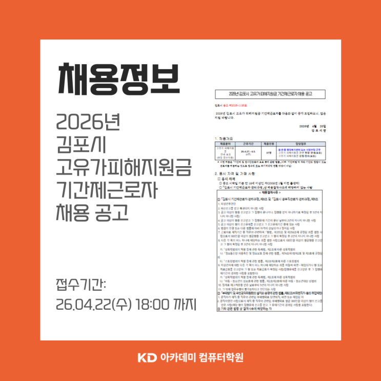 2026년 김포시 고유가피해지원금 기간제근로자 채용 공고 김포시 생활보장과 안녕하세요. 김포 장기동에 위치한 국비지원 컴퓨터 학원 KD아카데미 컴퓨터학원 김포 캠퍼스입니다. :) 오늘은 모집 진행 중인 2026년 김포시 고유가피해지원금 기간제근로자 채용 공고 소식을 전달해 드리려고 합니다! 이번 채용공고는 읍,면,동 행정복지센터 또는 시청TF팀 보조 인원을 채용한다고 하는데요, 행정복지센터 안내보조에 대한 채용공고에 관심이 있으셨던 분들에게 좋은 기회가 될 것 같습니다. 지금부터 자세한 채용정보와 지원 방법에 대해 함께 알아볼까요~? 1. 채용개요 채용분야 및 모집인원 - 고유가 피해지원금 안내 보조(현장 접수지원) [37명....... <img src="https://blogthumb.pstatic.net/MjAyNjA0MjFfMjc2/MDAxNzc2NzQwNzYwODUy.JLrVBQaNacwgUTgVHGmScvthQkHlm07pftJMTn42o7kg.INsG8pSpv4jwP2IE-4a7KRo2MtUTvER6wjuo2zOaJVcg.PNG/%C3%A4%BF%EB%C1%A4%BA%B8_-2026%B3%E2-%B1%E8%C6%F7%BD%C3-%B0%ED%C0%AF%B0%A1%C7%C7%C7%D8%C1%F6%BF%F8%B1%DD-%B1%E2%B0%A3%C1%A6%B1%D9%B7%CE%C0%DA-%C3%A4%BF%EB-%B0%F8%B0%ED-001.png?type=s3" />