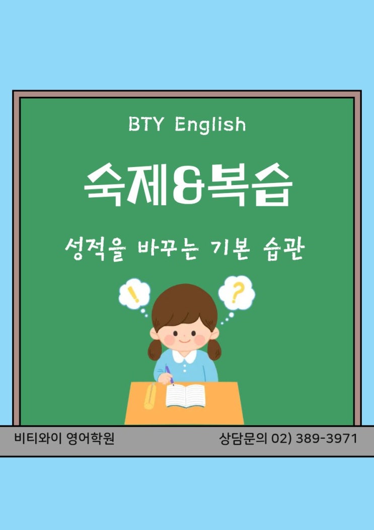안녕하세요 비티와이 영어학원입니다. 학생들이 꼭 실천해야 할 숙제 & 복습 관리 안내드립니다^^ -BTY English- BTY 영어학원 전화 : 02 - 389 - 3971 BTY 영어학원 위치 : 서울시 은평구 갈현로 271 (북경원 2층) -학원등록번호 제 02201700082호- ❤️ 블로그 : https://blog.naver.com/btyenglish ❤️ 인스타그램 : https://www.instagram.com/btyenglish/ ❤️ 홈페이지 : https://btyenglish.modoo.at/ #갈현초영어학원 / #선일초영어학원 / #연광초영어학원 / #구현초영어학원 / #은진초영어학원 #선일여중영어학원 / #대성중영어학원 / #선정중영어학원 / #예일여중영어학원 / #연신중영어학원 / #신도중영어학원 / #연천중영어학원....... <img src="https://blogthumb.pstatic.net/MjAyNjA0MjNfMjcx/MDAxNzc2OTI4MjgyMzcx.o3iPOywuzuPch7JhTLx47WcHn31OPntB-44IFcsAf00g.xV5mVJnBOVhGxVO8vRrXBJfgoVsQqmC0x38zdyPzELYg.JPEG/%BC%F7%C1%A6%BA%B9%BD%C01.jpg?type=s3" />