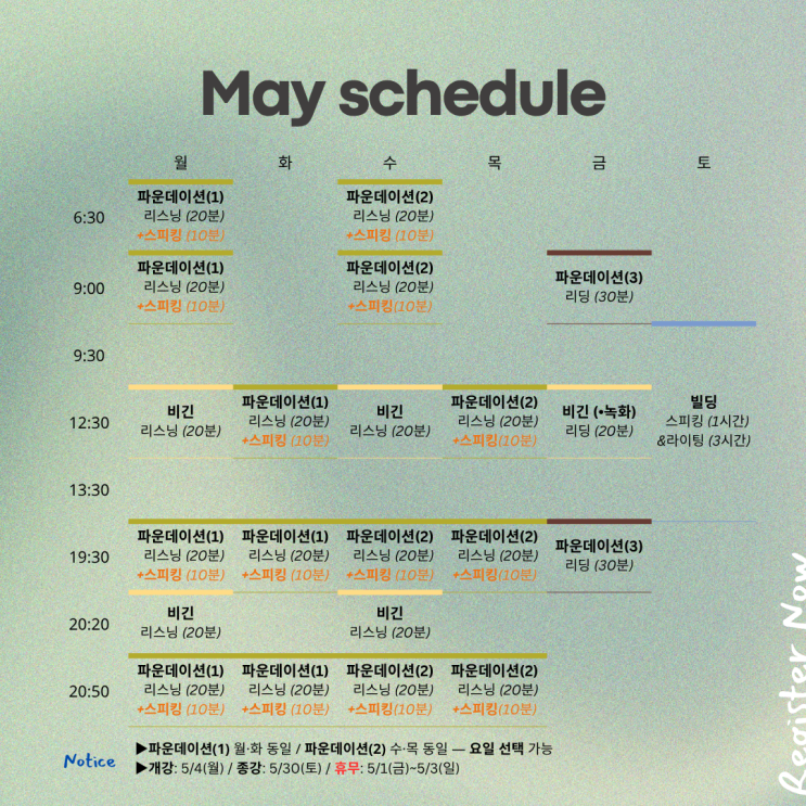 하루가 예상대로 흘러가지 않는 바쁜 날에는, 무언가를 완벽하게 하는 것보다 포기하지 않는 게 더 어렵습니다. 그럴 때는 스스로를 다그치기보다, 이렇게 생각해보세요. "나는 끝까지 나아가는 사람이다." 완벽하지 않아도 괜찮습니다. 혼자서는 끊기기 쉬운 영어 루틴, 이번에는 함께 이어가 봐요. 5월 클래스 오픈 •개강: 5/4(월) •종강: 5/30(토) •휴무: 5/1(금)~5/3(일) (*신촌점 수강생 분들에게는 추가할인을 적용해드립니다) #완벽보다완주 #포기하지않는사람 #끝까지간다 수강 문의는 언제든 카톡채널로 연락주세요 :) <img src="https://blogthumb.pstatic.net/MjAyNjA0MjBfOTkg/MDAxNzc2Njc5MjE3OTM0.wbGsiganH6ezrUAoV5_ntlw87hmYj6JhapIp-A4lgEkg.lOSM75w6-D23rqrFhRsQt9fbGJFmlaUenwoBk27G-1og.PNG/1.png?type=s3" />