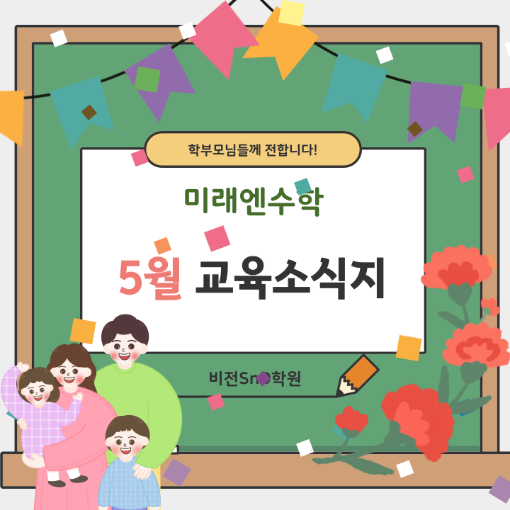 1:1 밀착 관리, 1등 수학 학습 시스템 미래엔수학 학부모님 안녕하세요! 수학 학습의 올바른 길을 제시하는 미래엔수학입니다 따스한 햇살이 반가운 '가정의 달' 5월이 찾아왔습니다. 미래엔수학에서는 지난 전국중간고사 결과를 토대로, 학습 상태를 점검하고 앞으로의 학습 방향을 더욱 체계적으로 설계할 예정입니다. 함께 전달드리는 분석표를 통해 자녀의 성취도를 확인해 보시기 바라며, 미래엔수학은 분석된 데이터를 바탕으로 한층 더 체계적인 학습 방향을 제시하겠습니다. 가정 내에서도 아이들이 꾸준히 학습할 수 있도록 많은 격려 부탁드립니다. 상담을 원하시는 학부모님께서는 비전snd학원으로 문의주세요! 감사합....... <img src="https://blogthumb.pstatic.net/MjAyNjA0MTNfMTgy/MDAxNzc2MDU5MTkxODAw.1X8i2aMVN0tCiEhCk62POg8Gg319FP9_7jrN404mkKYg._vthtQUOcKj_zZw48fB9GdKNKBuP6We-g8MHkE5d58og.PNG/%B1%B3%C0%B0%BC%D2%BD%C4%C1%F6-001_%282%29.png?type=s3" />
