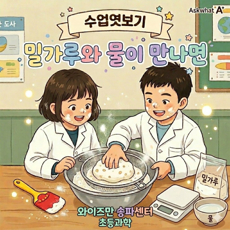안녕하세요! 와이즈만 송파센터입니다. 우리 아이들의 호기심 가득한 눈빛과 고소한 밀가루 냄새가 가득했던 초등 1학년 Askwhat A '밀가루와 물이 만나면' 수업 현장을 생생하게 전해드립니다! 뽀득뽀득 밀가루가 쫀득쫀득 반죽으로! ✨ 오늘은 우리 1학년 친구들이 꼬마 과학자가 되어 **'밀가루'**의 비밀을 파헤쳐 보았어요. 주방에서 흔히 보던 밀가루 속에 어떤 놀라운 과학이 숨어있는지, 함께 보실까요? 탐구 1. 보들보들 밀가루, "너 정체가 뭐니?" 먼저 강력밀가루와 박력밀가루를 직접 만지고 냄새 맡으며 관찰해 보았습니다. 색깔은 어때? "선생님, 둘 다 하얀색인데 조금 달....... <img src="https://blogthumb.pstatic.net/MjAyNjA0MjJfMTA4/MDAxNzc2ODM2MTMzODA1.wp1JZv71vqyvwYTPpr-75R29M2t0I7QUcPi_JzBVWDgg.jEM6zSkm0zI7Tnn5LVFCNMeH3O7043RE-Uyp-B0pp7Qg.JPEG/1eb44bf6-8a7f-4651-8510-ef8f28cf8eff.jpg?type=s3" />