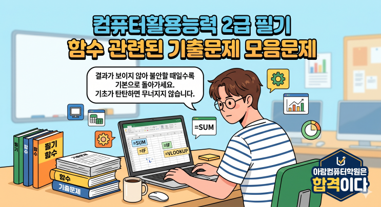 안녕하세요. 컴퓨터자격증다따네! 아람컴 아람돌이입니다. 컴활 2급 필기 공부하시는 분들께 조금이나마 도움이 되었으면 좋겠습니다. 아람 컴퓨터학원에서 특강 수업 시 엑셀 부문 설명할 때 드리는 함수 관련된 기출문제 자료 중 일부입니다. 문제 아래에 해답과 설명까지 직접 입력해 놓은 자료입니다. 엑셀 20문항 중 함수 관련 문제가 적으면 2문제 많으면 4문제까지 출제되는 경우가 있는데 다양한 함수 명령 통해 점수에 도움이 되었으면 좋겠습니다. 그리고 이 블로그 컴퓨터 자격증 카테고리 가시면 함수 관련된 과연도 문제 자료도 올라가 있으니 검색해 보시고 다운로드해서 공부하시길 바랍니다. 더 필요한 자료가 혹시 있으시면 메....... <img src="https://blogthumb.pstatic.net/MjAyNjA0MjBfMjMx/MDAxNzc2NjUyOTkyNDI2.eWwVWYepAwIkbKn2CAesysOtKaPbR1XbEDSDB5gR5X0g.cwRb0yhF-6h9Pt91FEl9dwt8hOch1yFOhOePQgdtVC8g.PNG/Gemini_Generated_Image_rk0bprk0bprk0bpr.png?type=s3" />