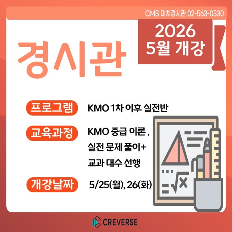 안녕하세요. CMS경시관입니다. 과목별 필수 중급 이론 및 1차 실전 문제풀이 프로그램 개강 안내입니다. 개강일은 5/25(월), 5/26(화) 입니다. 실전반 프로그램은 중급 이론, 1차 문제풀이 수업 뿐만 아니라, 교과대수 수업도 병행 가능합니다. 실전반 입학 문의는 경시관으로 연락 부탁드립니다. ☎02-563-0330 <img src="https://blogthumb.pstatic.net/MjAyNjA0MjFfMTQ4/MDAxNzc2NzcwMDk4OTg4.78u_O5gZ67Oj_JTxMnrMsFG1V4RlHkml0m7c9D131hgg.tcCUYlWsI1hUplIMlmxA6aqDvGbiuMYk8UMvzJVrc5Qg.JPEG/231006_MG_PPT_%C5%DB%C7%C3%B8%B42.jpg?type=s3" />