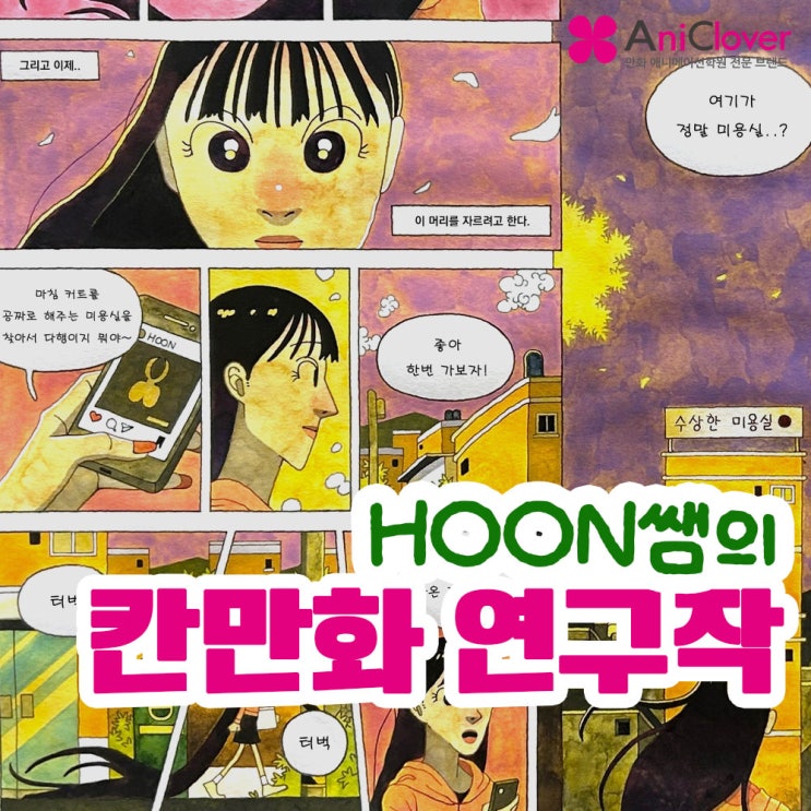 안녕하세요~ 동탄만화학원 애니 클로버를 담당하고 있는 HOON쌤입니다. 그동안 동탄만화학원 애니 클로버 블로그를 꾸준히 써왔던 사람이 바로 저였는데요, 이번에는 처음으로 글 속에 직접 등장하게 되었습니다. 그 이유는 단순히 학원 소식을 전하는 것을 넘어 학생들과 함께 성장하고 있는 현장의 이야기와 평소 학생들을 가르치는 HOON쌤이 어떤 그림을 그리고 있는지도 한 번 보여드리고 싶었습니다. 동탄만화학원 학생들의 개성과 가능성을 믿으며 함께 성장하고 있는 HOON쌤의 애니 클로버 이야기 오늘도 즐겁게 시작해 보겠습니다~!! 오늘 소개해 드릴 내용은 제가 그린 칸만화 연구작입니다. 제 그림을 제가 소개하니 기분이 참 이상하....... <img src="https://blogthumb.pstatic.net/MjAyNjA0MjhfNDMg/MDAxNzc3Mzc4MzQ3NDQw.OMpnl3x67dI8ePFPPWvbK5ViunVTYyBECcbceONeGMog.yFHV5oycrFpdaYwmKF_2Cbawb-LVzOCh-k2BQF5LOWMg.JPEG/00.jpg?type=s3" />