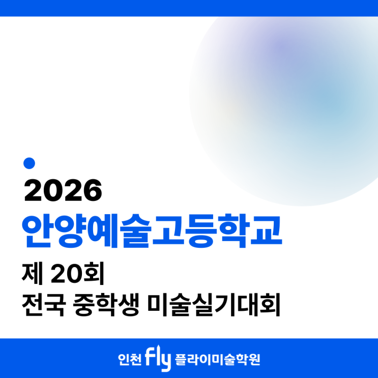 안양예술고등학교 제20회 전국 중학생 미술실기대회 인천 플라이 미술학원 안녕하세요! 인천 플라이 미술학원의 루다쌤이에요~ 오늘은 <안양예술고등학교 제20회 전국 중학생 미술실기대회>에 대해 알려드릴게요! 안양예술고등학교 제20회 전국 중학생 미술실기대회 참가정보 안양예술고등학교 제20회 전국 중학생 미술실기대회는 전국 중학교 재학생 및 동일 자격 소유자를 대상으로 실시됩니다. 참가접수는 온라인으로! 아트앤디자인 홈페이지에서 신청 가능합니다. https://artndesign.com/ 접수일자✔️ 2026년 4월 1일(수) 00:00 ~ 2026년 4월 22일(수) 24:00 참가비는 25,000원입니다! (인터넷 접수비 5,000원 포함) 대회일자✔️ 20....... <img src="https://blogthumb.pstatic.net/MjAyNjA0MThfMjY0/MDAxNzc2NDgzMTU5ODUw.sdxLMPhLHdnfDf3Y0fFK3XMH8DaYO-CQTGXoon6XHFAg.xLjWdfSEYNcoRnNLTy8ZxxQMznsYAyIIA0NTyf-L59wg.PNG/001.png?type=s3" />