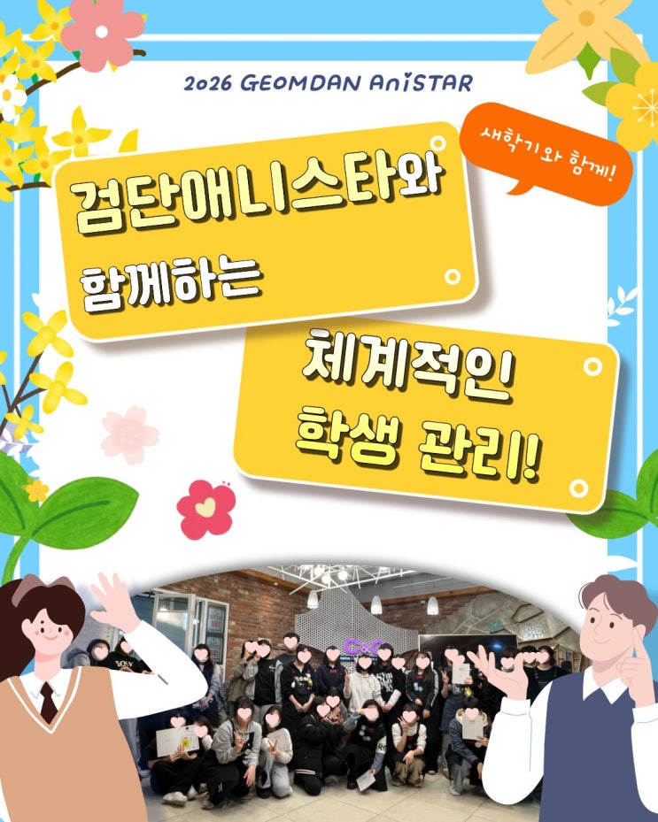 안녕하세요~~ 인천서구 검단C&C미술학원 애니관 애니스타입니다! 오늘은 많은 학부모님들이 궁금해하시는 검단애니스타 학생 관리 시스템에 대해 소개해드리려고 합니다. 실기는 '관리'가 결과를 만듭니다! 체계적인 관리 시스템 전공 탐색부터 입시까지 한 곳에서 가능하며, 학년별 체계적인 담임제 실기제도와 함께합니다. 담당 선생님과 함께 실력도, 자신감도, UP! 만화,애니 실기는 혼자 완성되는 것이 아니라, 학생을 관리하며 방향을 함께 만들어가는 과정입니다. 철저한 학생관리와 입시설계가 학생의 꿈을 완성해 나가는 과정입니다. 새학기의 시작은 검단애니스타와 함께! 만화로 꿈꾸고, 상상....... <img src="https://blogthumb.pstatic.net/MjAyNjA0MTRfMTE3/MDAxNzc2MTYxMjk0MzEw.jpiylE9jlq1hTrPVL5w691YsKKTwLQ8OU2eY8ntg-24g.YlJv1Zir5JwMMa3RnCU-wctYqT-C-9OydVAoFRE9W-Yg.JPEG/KakaoTalk_20260401_175928095.jpg?type=s3" />