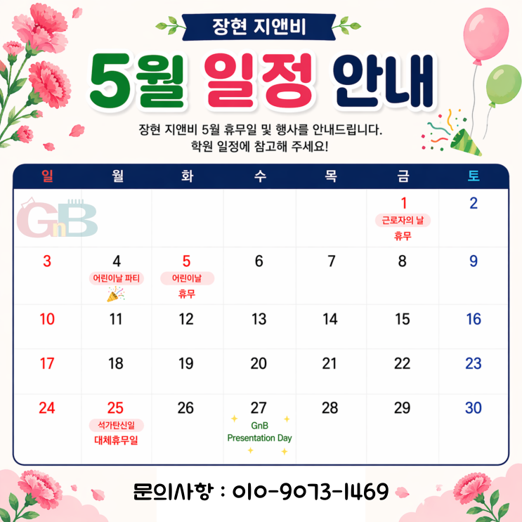 안녕하세요, 남양주 진접 장현지앤비입니다~ 벌써 5월이 코앞으로 다가왔네요! 가정의 달을 맞아 이번 달은 공휴일도 많고 특별한 행사도 가득한데요, 미리미리 일정 체크해 두시고 알차게 준비하세요! ️ 이번 달, 쉬는 날이 꽤 많아요! 남양주 영수학원 장현지앤비의 5월 휴무일을 미리 안내드릴게요! 5월 1일 (금) 근로자의 날 금요일이라 주말이랑 연결되는 꿀 연휴예요! 학원도 이날은 쉽니다~ 5월 5일 (화) 어린이날 우리 친구들 모두를 위한 날! 어린이날도 당연히 휴무예요 5월 25일 (월) 석가탄신일 대체휴무일 부처님 오신 날 대체휴무로 월요일도 쉬어갑니다. ✅ 5월 휴무일 : 1일 / 5일 / 25일, 총 3일! 수....... <img src="https://blogthumb.pstatic.net/MjAyNjA0MjNfNTkg/MDAxNzc2OTMyNTgwMTE3.j4g9D5N8wqY3dhRD_v6sbY8i0EJgd2LTfwcPbVyJWUgg.Jo-SuXy2l0qDXilIeXpB70oE9LtcngKvHed1R59uYXsg.PNG/%C1%A6%B8%F1%C0%BB_%C0%D4%B7%C2%C7%D8%C1%D6%BC%BC%BF%E4._%284%29.png?type=s3" />