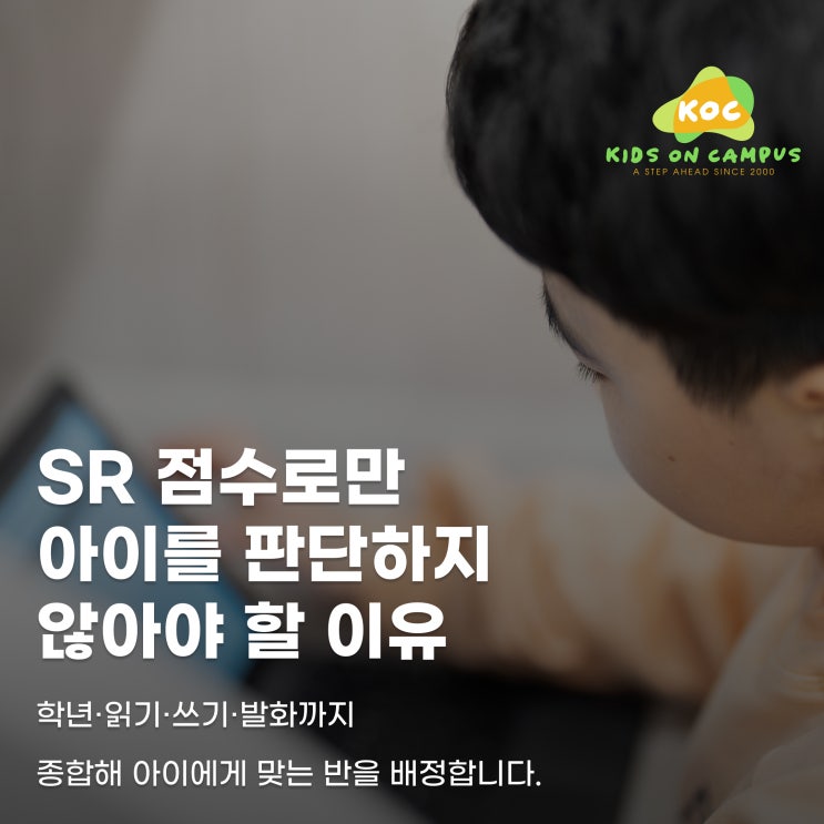 A STEP AHEAD SINCE 2000 수지 영어학원 키즈온캠퍼스학원 SR 점수 하나로 아이의 실력을 판단하고 반을 정하는 건 정확하지 못합니다. 그렇기에 키즈온캠퍼스는 다릅니다. 입학 시 SR 점수에 학년, 읽기·쓰기·발화 역량까지 종합해서 아이에게 딱 맞는 반을 배정하고, 입학 후에도 학기별 시험을 통해 아이의 성장을 지속적으로 확인합니다. SR 점수만으로는 부족한 이유 SR(Star Reading)은 아이의 읽기 수준을 수치로 보여주는 지표예요. 객관적인 도구이긴 하지만, 점수 하나만으로 아이의 영어 실력 전체를 판단하기엔 한계가 있습니다. 예를 들어 SR 점수가 비슷하더라도, 읽기는 잘 하지만 쓰기가 약한 아이가 있는가 하면, 말하기는 자신....... <img src="https://blogthumb.pstatic.net/MjAyNjA0MjNfMiAg/MDAxNzc2OTMxODkxNjIx.Xz7eXVekK3yesf5Z_M3G58ov6VfPOsvrZbRRmxodTKIg._wL2-5s8FJBkNbO3gVWdQpus7m0Rm33Uq7FEFJv1tyEg.JPEG/Frame_8.jpg?type=s3" />