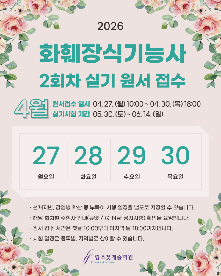 화훼장식기능사 2회차 실기시험 원서접수 안내 시험 일자: 5/30(토) ~ 6/14(일) 접수 시작: 4/27(월) 오전 10:00부터 접수 마감: 4/30(목) 오후 18:00까지 접수 방법: 큐넷(Q-Net) 홈페이지 https://www.q-net.or.kr/man001.do?gSite=Q ⚠️ 주의사항 ▲ 천재지변, 감염병 확산 등 부득이 시행 일정을 별도로 지정할 수 있습니다. ▲ 해당 회차별 수험자 안내(큐넷 / Q-Net 공지사항) 확인을 요망합니다. ▲ 원서 접수 시간은 첫날 10:00부터 마지막 날 18:00까지입니다. ▲ 시험 일정은 종목별, 지역별로 상이할 수 있습니다. ❗ 시험 일자 지정은 선착순으로 진행되니 빠르게 접수하셔야 합니다〰️♀️....... <img src="https://blogthumb.pstatic.net/MjAyNjA0MjRfMjgw/MDAxNzc2OTk2NjM3NDUx.c-J9zX7TsuKmmIAk28pRBeaZ26uv6OI3CP-mZrQVWh0g.0Pa_Wz2yFInDNKRQ0X2-udsnxCHwRk4zHLJotsFreeAg.PNG/0.png?type=s3" />