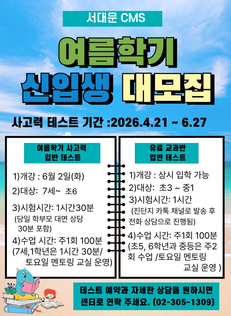 안녕하세요 서대문 CMS 입니다~! 26년도 여름학기 (6~8월) 사고력 입반 테스트 기간은 26년 4월 21일 ~ 6월 27일입니다. 기간 내에 테스트에 응시해야 여름학기 입반이 가능합니다. 아래 내용 확인 하신 후 입학 상담은 학원으로 연락 주세요. * 수강 관련 안내 사항 * 1. 시험 시간: 시험 시간은 총 60분 ~ 70분 소요되며, 시험 결과 상담이 20 ~ 30분 소요됩니다. 총 1시간 30분 정도 예상하시면 됩니다. (스케줄이 안 되실 경우, 시험만 응시한 후 전화 상담도 가능합니다.) 2. 시험 대상(수강 가능) 연령: 7세 ~ 초 6학년 응시 가능합니다. 3. 수업 시간: I.G 레벨 (7세~8세 대상 레벨) : 90분 (+학부모 브리핑 10분) Pre-WHY, WHY 레벨 : 10....... <img src="https://blogthumb.pstatic.net/MjAyNjA0MTFfMTQ2/MDAxNzc1ODc5MTg4Mzc4.uva1_itz6osvUwM36Yv5_-a_jKdg5r5YMG-1xhIA9dQg.EXVIA_9L0p0auVp5LSZeOiKU2PL3kbgTkHQsXcU3bOYg.JPEG/%BF%A9%B8%A7%C7%D0%B1%E2.jpg?type=s3" />