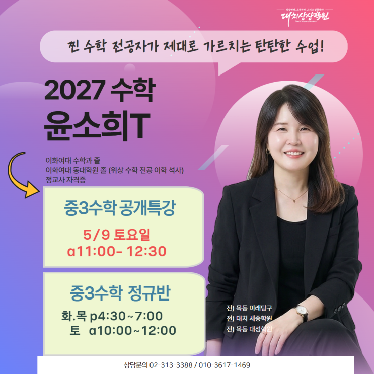 [대치상상] 중3 수학, 고등 내신을 결정짓는 마지막 골든타임 (feat. 윤소희T) 안녕하세요, 대치상상학원입니다. 중학교 3학년, 고등학교 입학까지 남은 시간이 길어 보이지만 수학만큼은 예외입니다. 중3 과정은 단순히 중등 과정의 마무리가 아니라, **고등 수학(공통수학)**의 뼈대를 만드는 가장 중요한 시기이기 때문입니다. 지금 갈팡질팡하고 있다면, 대치와 목동에서 검증된 '찐 전공자' 윤소희 선생님과 함께 제대로 된 빌드업을 시작해야 합니다. 왜 중3 수학이 불안하면 고등 내신이 무너질까요? 중3 과정에서 배우는 **'이차방정식과 이차함수'**는 고등 수학 전체를 관통하는 핵심 개념입니다. 여기서 구....... <img src="https://blogthumb.pstatic.net/MjAyNjA0MjFfMjM1/MDAxNzc2Nzc0MTk4MjY2._hZ7GOhIQ__uTOFzyEcL66ZCJAtA745A031-LdItwicg._sxXjpwNNizlupSqjTo04OsLdJfVLhtN4QNLi3ZRI7Yg.PNG/%C1%DF%B5%EE.png?type=s3" />