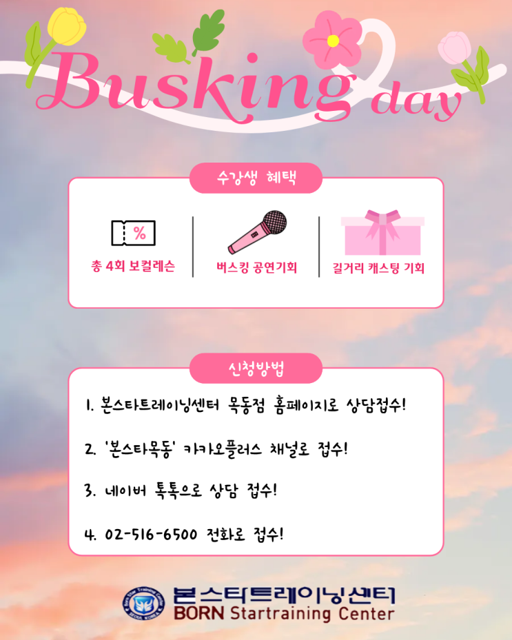안녕하세요! 요즘 점점 날이 좋아지고 있어요ㅎㅎ 날도 좋아지고 있어서 버스킹 하면 너무 좋을 것 같다는 생각에! 본스타트레이닝센터 목동점에서 버스킹 공연 인원 모집하려고 합니다ㅎㅎ 외부지원자 환영환영 대환영입니다 ^^^^ 나 길거리 공연해보고싶다! 나 남들앞에서 노래 불러보고싶다! 사람들과 같이 공연해보고싶다! 라는 생각을 가진 분들이라면 너무너무 대환영입니다ㅎㅎ 끝나면 뒤풀이도 있을 예정입니다! *강요 아니예요* 외부지원자분들은 위 포스터 신청방법을 통해 신청해주시면 됩니다ㅎㅎ 우리 좋은날에 같이 멋진 공연해봐요~~ㅎㅎ #목동보컬학원 #목동보컬취미 #목동보컬입시 #목동댄스학원 #목동보컬키즈 #목동키즈 #목동....... <img src="https://blogthumb.pstatic.net/MjAyNjA0MThfMTgx/MDAxNzc2NDgwMjc5Mzg4.CSAC2TsSyO19hXIwueZYrQsxee5aQhL6CdvasqFFrO4g._q2qioVFWDwmmX_HY9HnRKxL0ta6pEx2cIsMD9P1UvMg.PNG/%C1%A6%B8%F1%C0%BB_%C0%D4%B7%C2%C7%D8%C1%D6%BC%BC%BF%E4._%2826%29.png?type=s3" />