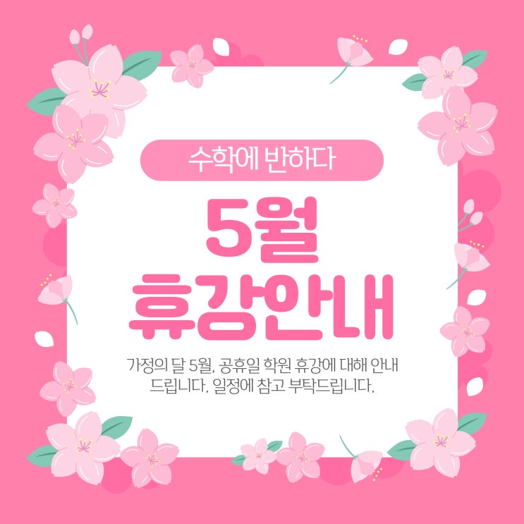 안녕하세요. 수학에 반하다입니다. 5월 공휴일 휴강 관련 공지드립니다. 5/1(근로자의 날), 5/5(어린이날), 5/25(부처님 오신날 대체공휴일) 휴강합니다. 일정에 참고하시어 방문에 불편함이 없으시길 바랍니다. 감사합니다. :-) <img src="https://blogthumb.pstatic.net/MjAyNjA0MjFfMjQg/MDAxNzc2NzYxNzM2NjM4.oK7LF83AAmiGc4JTKdmAc2-vg1e7JnKnz1tWF3jpCEAg.fpjpJgJQmwoMi0SV3p3Luvv0bv4AuqPH0DP2LRfp7kkg.JPEG/%C1%A6%B8%F1%C0%BB-%C0%D4%B7%C2%C7%D8%C1%D6%BC%BC%BF%E4_-001_-_2026-04-21T174943.741.jpg?type=s3" />