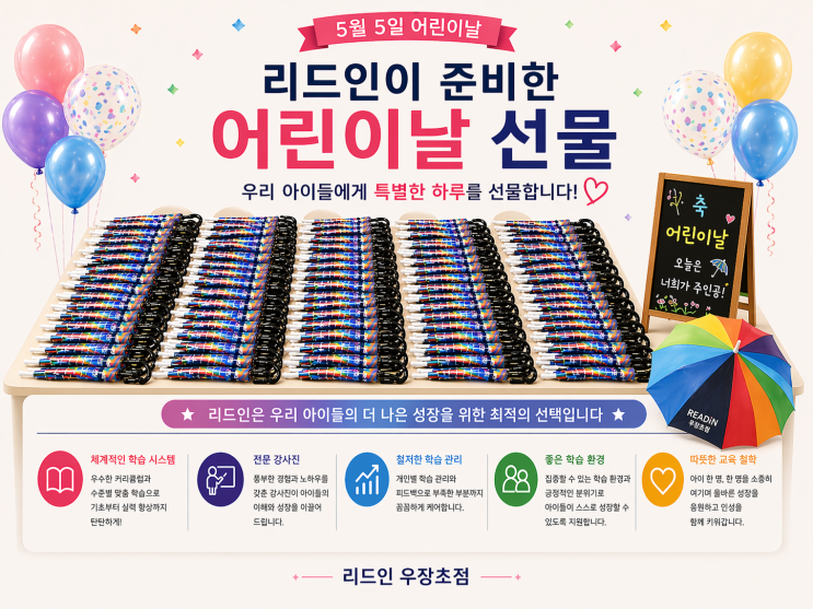 어린이날이 다가왔습니다 아이들의 웃음이 한층 더 반짝이는 계절입니다. “이번엔 어떤 선물을 해줄까?” 고민하시는 어머니들도 많으시죠. 리드인도 아이들을 위해 작지만 기분 좋은 선물을 준비했습니다. 알록달록 우산처럼, 아이들의 하루가 조금 더 즐거워지길 바라는 마음입니다. 그런데 한편으로는 이런 생각도 함께 담고 싶었습니다. 선물은 하루를 기쁘게 하고, 읽는 힘은 아이의 시간을 바꾼다는 것. 리드인에서는 책을 단순히 읽는 것에서 끝나지 않습니다. 읽고, 생각하고, 자신의 말로 표현하는 과정까지 차근차근 쌓아가고 있습니다. 그래서 아이들은 어느 순간, 조용히 달라지기 시작합니다. 글이 또렷해지고, 생각이 깊어지고, 자....... <img src="https://blogthumb.pstatic.net/MjAyNjA0MjNfMjQg/MDAxNzc2OTIxNzI2MjAz.VBCYRV28VH6INALxMPQ8vrR0hKp8yvRH8E3OO8yNqYEg.-lXn-rh_8wayYPOcAUkiwJf3SDJY8eI9--CdUVrwEiQg.PNG/image.png?type=s3" />