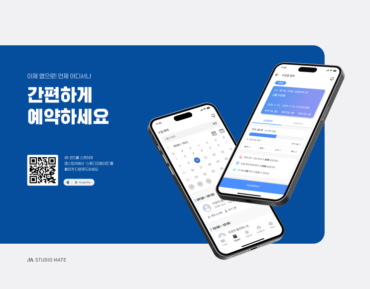 안녕하세요. 구미 성인 피아노 학원 <감성 피아노> 입니다 :) 5월 부터 <감성 피아노>는 레슨 예약 및 변경을 편리하게 '스튜디오메이트' 어플을 통한 예약제로 운영하려 합니다 ! 아래 안내 확인 부탁드립니다. 아래 qr 코드 찍고 다운로드 하시거나 아이폰(ios) 앱스토어에서 '스튜디오메이트' 검색 후 다운로드 안드로이드(Android) 구글 플레이스토어에서 '스튜디오메이트' 검색 후 다운로드 * 로고는 흰색 배경에 검은색 글자인 어플 다운로드 해주세요 ! (관리자용 안됩니다 !!!!!!) 회원가입 시 성함과 연락처만 정확히 입력해 주시면 수강권이 자동으로 생성되어 편하게 이용하실 수 있습니다....... <img src="https://blogthumb.pstatic.net/MjAyNjA0MzBfNzAg/MDAxNzc3NTQxMDQ0MjE3.3UJFuJcOOzgeiV-SpwaXEkISS7vkl2p9LXNJ8pRaGvYg.62CGUYq01glFDHnyaxSpERvejbVzYuGDra41uK5E6Tsg.PNG/%C8%B8%BF%F8%BE%DB%B4%D9%BF%EE%B7%CE%B5%E5Ver1_Blue.png?type=s3" />