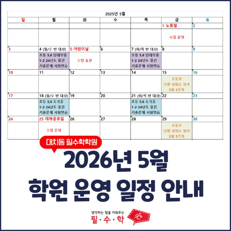 이제 곧 있을 4월 중간고사가 지나가면 잠깐의 휴식과 재정비의 시기인 5월이 다가오고 있습니다. 일대일 개별맞춤 수학 대치동 필수학에서 5월 한 달 간 운영일정을 안내드립니다. 우선 5월 7일 목요일 고3들을 대상으로 한 전국연합 모의고사가 있습니다. 중요한 모의고사인 만큼 고3 학생들 모두 화이팅입니다! 그 외에 5월에는 5월 1일 노동절 5월 5일 어린이날 5월 25일 부처님오신날 대체공휴일 까지 공휴일이 많은 달입니다. 쉴 때는 쉬고 공부할 때는 공부 열심히 하는 한 달이 되었으면 좋겠습니다. 초중등부에서는 초등 5-6학년 학생들을 대상으로 중등내신 중간고사 선경험을 통한 중학 내신 시험 대비가 2주와 4주차에 지속적으로 실....... <img src="https://blogthumb.pstatic.net/MjAyNjA0MjJfMTU4/MDAxNzc2ODQ1MTc5MDgy.AnDM6Xew7Yt_2gfUOMTZtUDQwVmRtKcnR0T9iv5LqYsg.WxIcv_k3Xvm4y8It52qvR5GkdmWU9GZEG5t3ldau4Bog.JPEG/%BF%F9%B0%A3_%C4%B6%B8%B0%B4%F5_%C0%DB%BE%F7_%289%29.jpg?type=s3" />