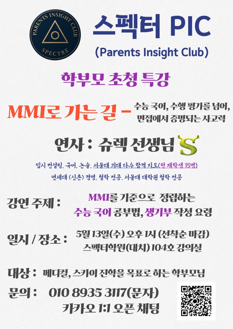 안녕하세요. 스펙터 학원입니다. 메디컬, 스카이를 목표로 하는 학부모님들을 위한 특별한 행사를 이번 5월에 가지게 되었습니다. 스펙터 PIC(Parents Insight Club)에서는 서울대 의대(현 재학생 15명)를 비롯한 다수의 메디컬 합격생과 스카이 합격생을 지도하신 슈렉 선생님을 모시고 MMI에서 요구하는 사고력을 기준으로 수능 국어 공부법, 생기부 작성법에 대한 특강을 개최하게 되었습니다. MMI(Multiple Mini Interview)란 무엇인가요? ‘다중 미니 면접’, 주로 의예과에서 실시하는 인적성 면접. MMI 준비법은 물론이고 수능 국어와 생기부 작성에 대한 올바른 접근법에 대해 심도있는 강의가 진행될 예정입니다. 선착순 마감이오니 관....... <img src="https://blogthumb.pstatic.net/MjAyNjA0MjJfMzIg/MDAxNzc2ODQ4ODM3NDU0.gYbDQ9MbOvAk90Zu-KWIh0Ql8gPbG0XDbcsYopfYPpgg.vt3Bze081NtgasfXAY1Lz_fVtkOkO0iEmmAvGI8vXO0g.JPEG/%BD%B4%B7%BA%BD%DC_%C3%CA%C3%BB%C6%AF%B0%AD.jpg?type=s3" />