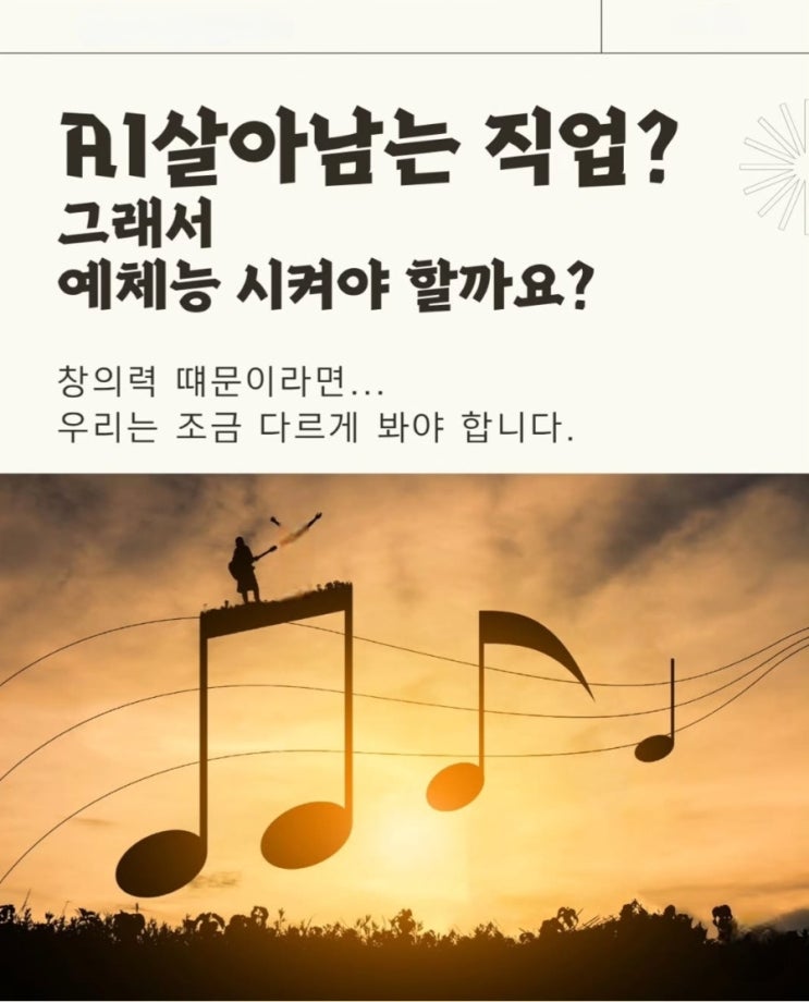 안녕하세요,정하피아노입니다. 요즘 부모님들과 상담하다 보면 "AI 시대에는 어떤 직업이 살아남을까요?","창의력을 키우려면 예체능을 꼭 시켜야할까요?"라는 질문을 참 많이 받습니다. 기술이 발전할수록 교육의 방향에 대한 고민이 깊어지는것은 당연한 일이지요. 하지만 우리는 조금 다른 시각으로 이 문제를 바라봐야 합니다. ' 창의력 = 예체능'이라는 단순한 공식? 흔히들 AI 시대니까 창의력이 중요하고,그래서 악기 하나쯤은 배워야 한다고 말합니다. 하지만 단순히 창의력을 키우기 위한 '수단'으로만 음악을 접하기엔 그 가치가 너무나 큽니다. 음악의 본질은 '느끼고 표현하....... <img src="https://blogthumb.pstatic.net/MjAyNjA0MThfMjU0/MDAxNzc2NTAzNTExNTQx.G8turWOD-1uE9mmD8-nGmuYfdmdyuQh_rjWgXTPd1Qwg.eJe6nk14h4aoVTkuhFJrveryjHu1m-YZLd9Uc2SHtVAg.JPEG/900_1776503126282.jpg?type=s3" />