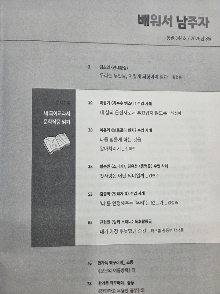 수업 후 글쓰기 논술잡지 배워서남주자 2026.8 수록 원고 편집 엇박자D ‘나’를 인정해주는 ‘우리’는 없는가? 엇박자D / 김중혁 / 비상 고1국어 수록 작품 안내 엇박자D / 김중혁 / 문학동네 [악기들의 도서관] 속 단편 작가 김중혁은 소리, 음악을 소재로 다양한 단편소설들을 모아 [악기들의 도서관] (2008년 문학동네)를 펴냈다. 엇박자D는 8편의 단편 중 마지막 작품으로 2008년 김유정 문학상을 수상했다. 엇박자를 내면서도 전체의 아름다움에 하나가 되고자 하는 개인의 소망을 다룬 작품이다. 이 작품은 2018년 개정된 고등학교 국어교과서(비상 고1 공통국어1 / 편집 강호영)에 수록되었다. 슈퍼마켙 계산대에서 동전을 세다가 주변....... <img src="https://blogthumb.pstatic.net/MjAyNjA0MjBfMTMg/MDAxNzc2Njg4MjYzMDAx.McSrYLXF8lxBkP8TPeu170kJzvYEb-WvCZ4fXZAc0SEg.CuWMB6Z4BpxwhHlVxeOwFnE1rgIjYA5y2IUZ7wO0CgIg.JPEG/%3F%97%87%EB%B0%95%EC%9E%90D_%EB%B0%B0%EB%82%A825.8%3F%98%B8_%EB%AA%A9%EC%B0%A8_%3F%82%AC%EC%A7%3F.jpg?type=s3" />