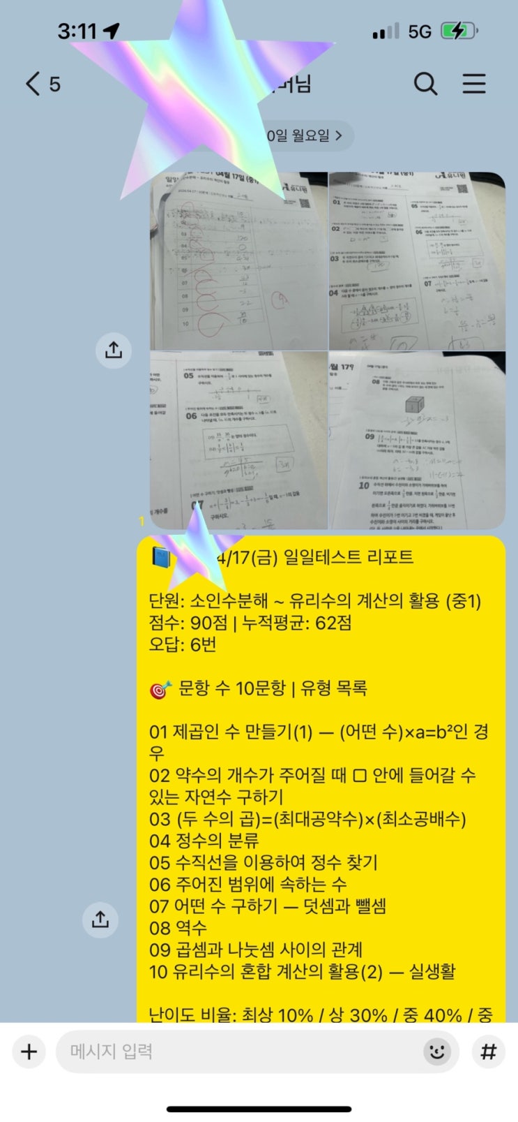 안녕하세요. 여의도 수학학원에서 10년 넘게 학생들의 고장 난 수학 공부법을 고치고 있는 유니원 수학의 동혁 쌤입니다. 오늘은 4월 17일 금요일에 진행한 중1 동혁이의 일일테스트 결과를 정리해 보려 합니다. 단원은 소인수분해부터 유리수의 계산의 활용까지이고, 10문항 기준으로 난이도는 최상 10%, 상 30%, 중 40%, 중하 20%로 구성했습니다. 오답 유형을 분석하고 다음 수업에서 어떻게 잡아줄지를 중심으로 정리합니다. ◆ 이번 테스트 결과 이번 점수는 90점입니다. 동혁이의 누적 평균이 62점인 것을 감안하면 상당히 올라온 결과입니다. 10문항 중 오답은 6번 하나였습니다. 문항 구성을 보면 01번 제곱인 수 만들기, 02번 약수의 개....... <img src="https://blogthumb.pstatic.net/MjAyNjA0MjBfMjI4/MDAxNzc2NjY2Mzg5ODg2.yEBKskUGuAoZqS6SLTCPos90MnnkNyHQ_BWd_mwl1k4g.1a6t9_U0NSxjJ-azzqLsTwGJsFeYIyq4qz53E1u0QHIg.JPEG/IMG%A3%DF6053.JPG?type=s3" />