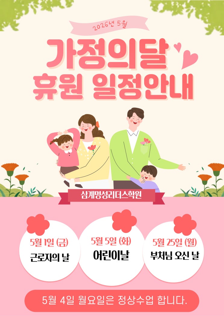 5월 1일 근로자의 날이 공휴일로 지정됨에 따라 5월 1일 (금) 근로자의 날 5월 5일 (화) 어린이날 5월 25일 (월) 대체공휴일 휴원하니 참고바랍니다. 5월 4일 월요일은 학교는 재량휴업일이지만 학원은 정상 등원합니다. 부모님께서 상담하시는 동안 학생 테스트 와 담당 선생님 면담 가능합니다. 원하시는 부분 상담 하루 전까지 말씀해 주시면 준비하도록 하겠습니다. 국어문해력테스트 &독서진단평가, 독서 능력평가 영어: 잉글루 SLT 레벨테스트 (SLT 중급 이상 JET 평가 및 분석) 씨투엠사고력수학학년별 테스트 학년별 교과 종합진단평가 삼계명성리더스학원 ❤️ 카카오톡 플러스친구 : 명성리더스 ❤️ 인스타그램 :....... <img src="https://blogthumb.pstatic.net/MjAyNjA0MjhfMjM5/MDAxNzc3MzUxMjQ5Mzg2.4GIWkm4gAKNR01NxAy0YuvAac9qKBq7HLgPV-AMw1cgg.8o20GZkOBaL6xlMUJ5fo8pgjvTsAi4PhftWRwEW19q8g.JPEG/%C1%A6%B8%F1%C0%BB_%C0%D4%B7%C2%C7%D8%C1%D6%BC%BC%BF%E4._%281%29.jpg?type=s3" />