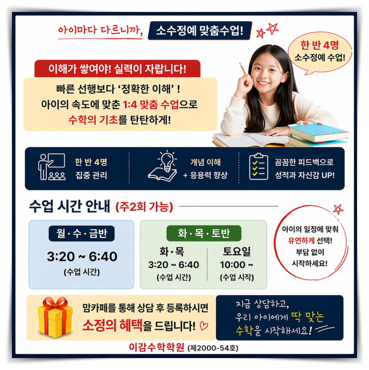 ● ● ● 초등학교 어머님들과 상담을 하다보면 공통적으로 많이 하시는 말씀이 있습니다. "선행은 어느 정도 되어 있는데 정작 아이가 스스로 이해한 느낌이 아닌거 같아요" 또 "문제를 풀긴 하는데, 조금만 바뀌면 바로 막혀요" 이 시기에는 단순히 진도를 빨리 나가는 것보다 개념을 정확히 이해하고, 스스로 풀수 있는 힘을 만드는 것이 중요 합니다. 그래서 중계동수학학학원 이감수학학원 에서는 초등학교 4~6 학년을 대상으로 한 반 4명 소수정예 맞춤수업반을 추가로 개설하게 되었습니다. 왜.... 4명 소수정예 인가요? 아이마다 이해 속도도 다르고 막히는 지점도 모두 다릅니다. 대형 판서수업에서 놓치기 쉬운 부....... <img src="https://blogthumb.pstatic.net/MjAyNjA0MTFfMTY0/MDAxNzc1ODc5MzgwNDk3.xr0fh3qyOz3sXMOg1zAY2mR6uhr0LBWFYQjGU-x_Wpsg.0r4P4U2ioDQQ17Wz0WW4v84kpoxdV5GeYUQZmpFNhOYg.PNG/%C3%D6%C1%BE.png?type=s3" />