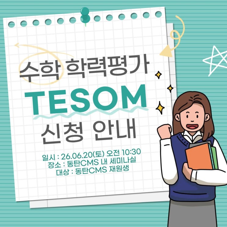 초·중등 시기의 학습은 방향을 점검하고 실력을 객관적으로 확인하는 것이 매우 중요합니다. 특히 수학은 꾸준한 진단과 피드백이 필요한 과목인데요. 우리 학원에서는 학생들의 현재 수준을 정확히 파악하고, 앞으로의 학습 계획을 효과적으로 세우기 위해 수학 학력평가인 "TESOM"을 실시할 예정입니다. CMS동탄에서 진행하는 TESOM 수학학력평가에 참여하기 위해서는 네이버 폼을 통한 사전 신청이 필요합니다. ◇ 시험 일시 ◇ TESOM 수학학력평가 ▶2026년 6월 20일 (토) 오전 10시 30분 ◇ 시험 대상 ◇ ▶동탄CMS 재원생 ◇ 시험 장소 ◇ ▶동탄CMS 학원 내 세미나실 ◇ 대비 모의고사 ◇ ▶특강 : 6/6(토), 6/13(토) 2주간 진....... <img src="https://blogthumb.pstatic.net/MjAyNjA0MjBfMjU2/MDAxNzc2Njc5MzQ1OTkz.5m25C-DcU1Q0Y_Sx_tvBuP1YDdvM2a1ODMU_7gzr9eUg.XTUhMvCgHDxSixxZw9zeZhrMsiPFfL4Dx7Gh5f3emH0g.JPEG/%C1%A6%B8%F1%C0%BB_%C0%D4%B7%C2%C7%D8%C1%D6%BC%BC%BF%E4._%281%29.jpg?type=s3" />