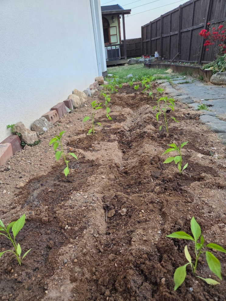 #태평리한글공부 자난주에 모종을사러 갔었지요. 모종 파시는 사장님왈 지금심으면 화요일에 온도 떨어져 다죽으니 다음주에 심으라고 하셨죠. 정직한 사장님 감사합니다. 그래서 드디어 모종을 샀어요. 청양고추6주 꽈리고추2주 가지고추 2주 아삭이고추 2주 상추 로메인 5개 케일 5개 오이 4주 그리고 가지 2주 이렇게샀어요. 총 14,000원을 지불했어요. 그리고 미리 갈아놓은 작은 우리집 텃밭에 차례대로 심었어요. 고추죠. 심고나니 뭐가뭔지 모르겠어요. 자라면 뭐가뭔지 알게되겠죠. 로메인상추와 케일입니다. 이것도 케일이죠. 오이입니다. 너무 작게 찍었나봐요. 가지입니다. 참고로 작년에는 오이가 풍년이었고 재작년에는 가지가 풍년....... <img src="https://blogthumb.pstatic.net/MjAyNjA0MjVfMjQ0/MDAxNzc3MTIxMDUzNjYw.QEye3kc2Fewi6f8xN43bFfwsc14MVpOrA3HjY6sKyTIg.7eqtEHoNeCkUvmttZNMn1Xe4lZgni-V_-cgjhuI5vmgg.JPEG/900_20260425_190408.jpg?type=s3" />