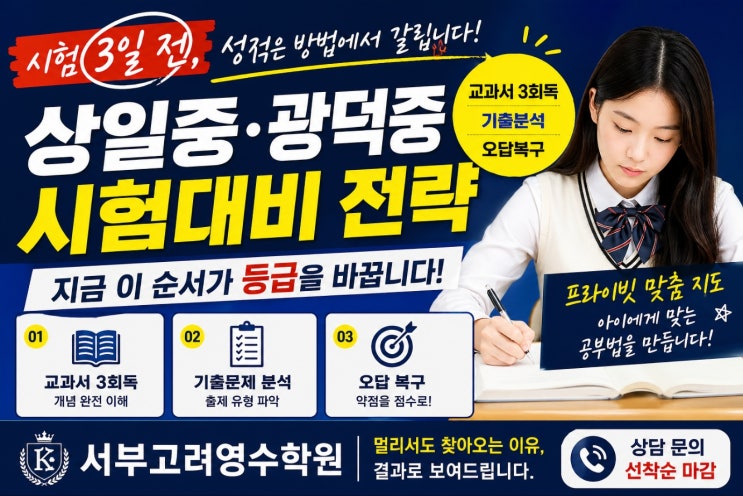 상일중 광덕중시험대비 내방동 문원장이 함께 합니다 “우리 아이, 분명 열심히 했는데 왜 성적이 안 나올까요?” 상일중·광덕중 학부모 상담에서 가장 많이 듣는 질문입니다. 그런데 문제는 노력의 양이 아니라 **중학생 시험공부 방법, 즉 ‘순서’**에 있습니다. --- 시험 3일 전, 성적은 ‘방법’에서 갈립니다 지금은 새로운 문제집을 늘릴 시기가 아닙니다. 이미 배운 것을 점수로 바꾸는 단계입니다. 서부고려영수학원에서는 상일중 광덕중 시험대비를 이렇게 설계합니다. --- 1. 교과서 3회독 – 성적의 뿌리를 잡습니다 많은 학생들이 교과서를 “봤다”고 말하지만 실제로는 이해 없이 지나가는 경우가 많습니다. 그래서 저희는 구조화....... <img src="https://blogthumb.pstatic.net/MjAyNjA0MjhfMjg0/MDAxNzc3MzU0NDg0MTM0.4ARbLVXkpHNoV_w2UWJUPx-CE4NjUShq5BcoF1TlNHgg.t3QY88Be8300-JJJYMCOhUfzh4tY7H0UHMsn9f76aucg.JPEG/KakaoTalk_20260428_143226995.jpg?type=s3" />