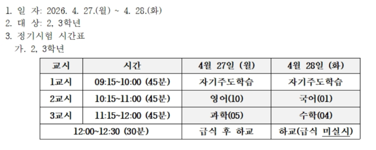 [행신중 1차 정기시험] 2·3학년 국어 완벽 대비! 노력한 만큼 빛나는 결과를 응원합니다 행신중 2, 3학년 1차 정기시험 일정 안녕하세요! 행신중학교 학생들의 든든한 국어 길잡이, 임연희 독서논술학원 원장입니다. 어느덧 새 학기의 첫 관문인 1차 정기시험이 코앞으로 다가왔습니다. 우리 아이들, 밤낮으로 책상 앞을 지키며 참 열심히 준비하고 있는데요. 오늘은 행신중학교 2학년, 3학년 학생들의 시험 일정과 함께, 우리 학원에서 어떻게 국어 시험을 빈틈없이 대비했는지 안내해 드리려고 합니다. 등락을 가르는 '논술형 문항', 어떻게 대비했을까요? 표에서 보시다시피 2학년은 3문제, 3학년은 2문제가 '논술형'으로....... <img src="https://blogthumb.pstatic.net/MjAyNjA0MjZfMjQ3/MDAxNzc3MjA2MTQ5NTc4.w9j4CiX954rFzY2J8Qf-laQGV-mQZccJ4WZ5hbVPom4g.8GuXQD68UzZuV7CtKJg1c9BFRC_x0tCiz2WWLb69UU4g.PNG/%BD%BA%C5%A9%B8%B0%BC%A6_2026-04-26_211216.png?type=s3" />