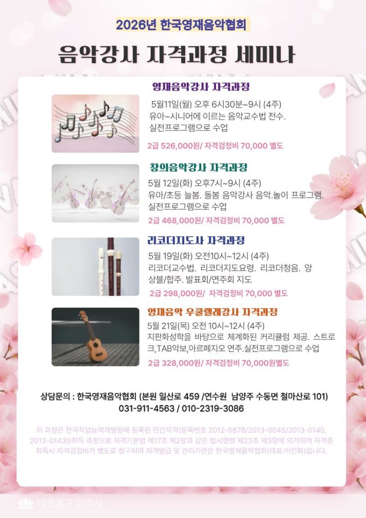한국영재음악협회에서는 아래와 같이 음악강사자격과정을 개최합니다. 본 협회의 영재음악교수법과 창의음악, 리코더와 우쿨렐레 강사 자격과정은 음악강사라면 반드시 알아야 할 세계3대 교수법을 비롯하여 우리나라 음악교육에 알맞는 영재음악교수법을 체계적으로 배우는 과정입니다. 문화예술강사. 늘봄/돌봄강사. 방과후음악강사. 발달장애음악강사. 시니어음악전담강사 유아음악강사 및 각 센터 수업에 모두 적용되며, 실전에 필요한 프로그램 교육 후 그대로 수업에 활용할 수 있습니다. 한국영재음악협회의 모든 프로그램은 27년간 임상을 거쳐 검증된 프로그램만을 공유하며, 태교음악부터 시니어, 음악영재, 서번트, 발달장애 음악수업....... <img src="https://blogthumb.pstatic.net/MjAyNjA0MjJfMTM3/MDAxNzc2ODMyMTkyNDI5.PO1cx9dP6ivgaZBzlWG5sa9Ntbt1PFKp8NcYq8FsOoQg.97cp78LsnAKfGawkk14MhbVopZB8bqWKlU2z6AmgUnsg.JPEG/2026_%C0%BD%BE%C7%B0%AD%BB%E7%C0%DA%B0%DD%B0%FA%C1%A4_%283%29.jpg?type=s3" />