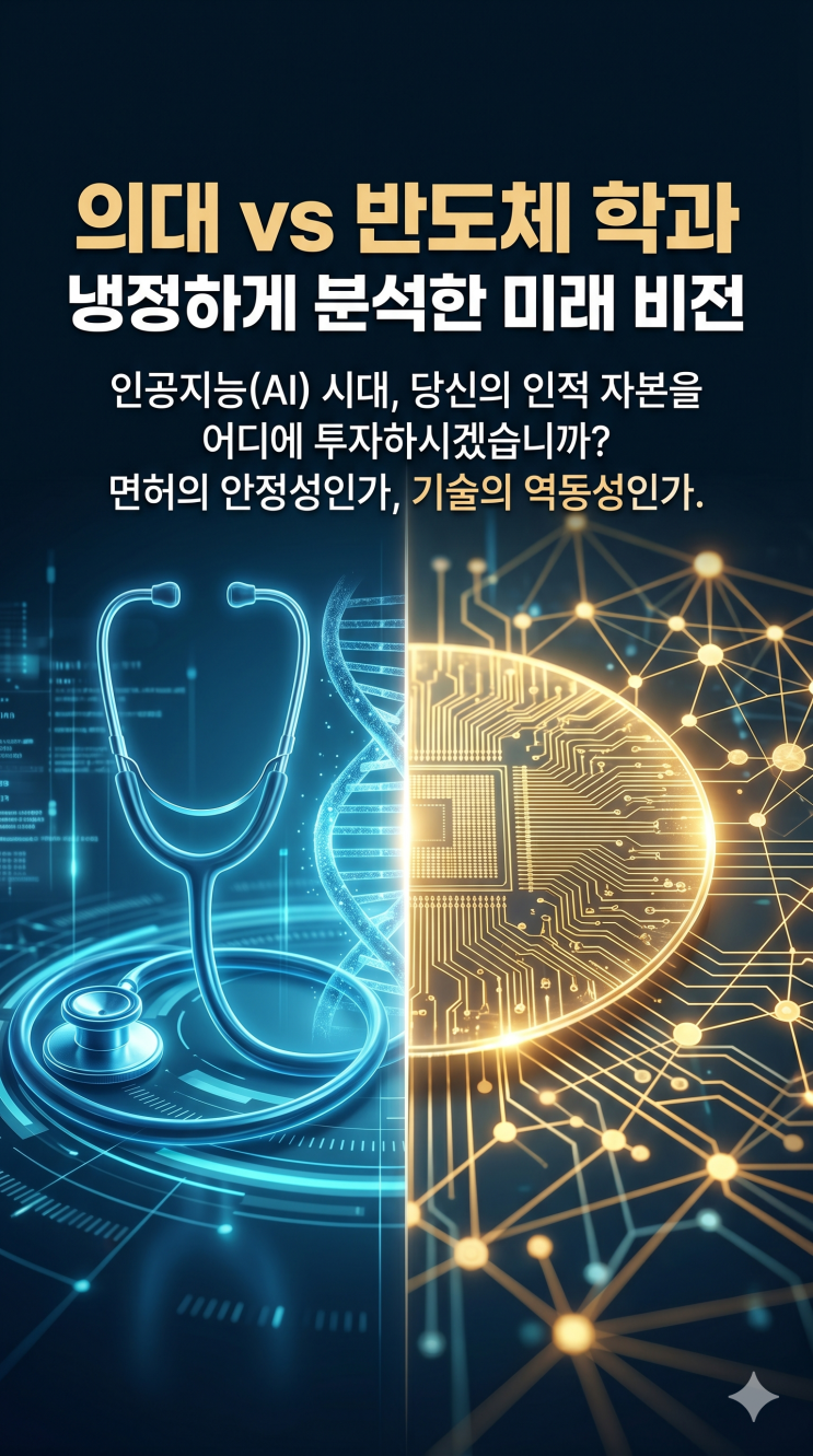 요즘 입시 시즌부터 직장인 커뮤니티까지 가장 뜨거운 화두! 바로 '의대 vs 반도체 학과' 어디가 진짜 승자인가 하는 고민이죠? 전통의 강자 의대냐, 아니면 AI 시대를 타고 날아오르는 반도체냐! 여러분들의 인생이 걸린 중요한 선택인 만큼, 오늘은 언니가 아주 냉정하고 꼼꼼하게 비교 분석해 드릴게요. 글이 조금 길 수도 있지만, 끝까지 읽으면 내 미래를 어디에 투자해야 할지 확실히 감이 오실 거예요! ✨ 그럼 이제 본격적으로 의대 vs 반도체 냉정 분석 시작합니다! 1. 입시 지형의 변화: '의대 불패'의 성벽은 무너졌을까? 요즘 뉴스 보면 "의대 대신 반도체 간다"는 기사가 정말 많....... <img src="https://blogthumb.pstatic.net/MjAyNjA0MjBfMjIw/MDAxNzc2NjUwNTExODcx.V7bo4gSOJli4OG1ho30Wu8P_BCXE4BRvuG82-WkgX-8g.YsJAemtjvOivWZHgDONTYJ2FmzMHrnx_YKrKHbJKLqog.PNG/Gemini_Generated_Image_xtjkl0xtjkl0xtjk.png?type=s3" />