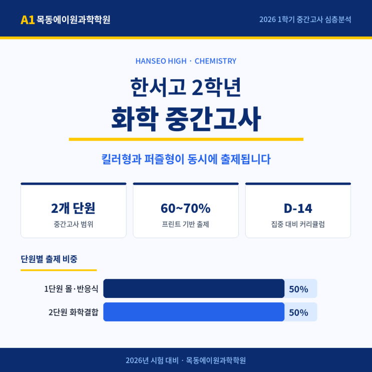 한서고 2학년 화학, 킬러와 퍼즐형이 동시에 나오는 시험입니다! 안녕하세요. 목동에이원과학학원 입니다. 오늘은 실제 지도 경험을 바탕으로 한서고 2학년 화학 중간고사의 단원별 출제 성격과 상위권에서도 반복되는 실수 유형을 정리해 드리겠습니다. 한서고 2학년 화학은 킬러형과 퍼즐형이 동시에 출제되는 시험입니다 시험 범위와 단원별 출제 성격 이번 중간고사 범위는 1단원 몰과 반응식, 2단원 화학 결합과 분자 모양 두 파트입니다. 두 단원의 출제 비중은 비슷하지만, 고난도 문항의 성격이 단원별로 뚜렷하게 나뉜다는 점이 한서고 2학년 화학의 가장 큰 특징입니다. 1단원에서는 킬러 문항이 출제됩니다. 몰 계산과 반응식 풀이를....... <img src="https://blogthumb.pstatic.net/MjAyNjA0MThfMjcw/MDAxNzc2NDkxOTA0NzY3.3_v4UfYJ-ZqlxgpN8I4-KbUC-cGJkyc6fu_9rUTKSO8g.aZ3yqKc4-i4bEuRg4TB5eOPFAsEiUaLKD5Cnlx6vNZwg.PNG/%BF%A1%C0%CC%BF%F8%C4%AB%B5%E5%B4%BA%BD%BA_01_%C7%A5%C1%F6.png?type=s3" />