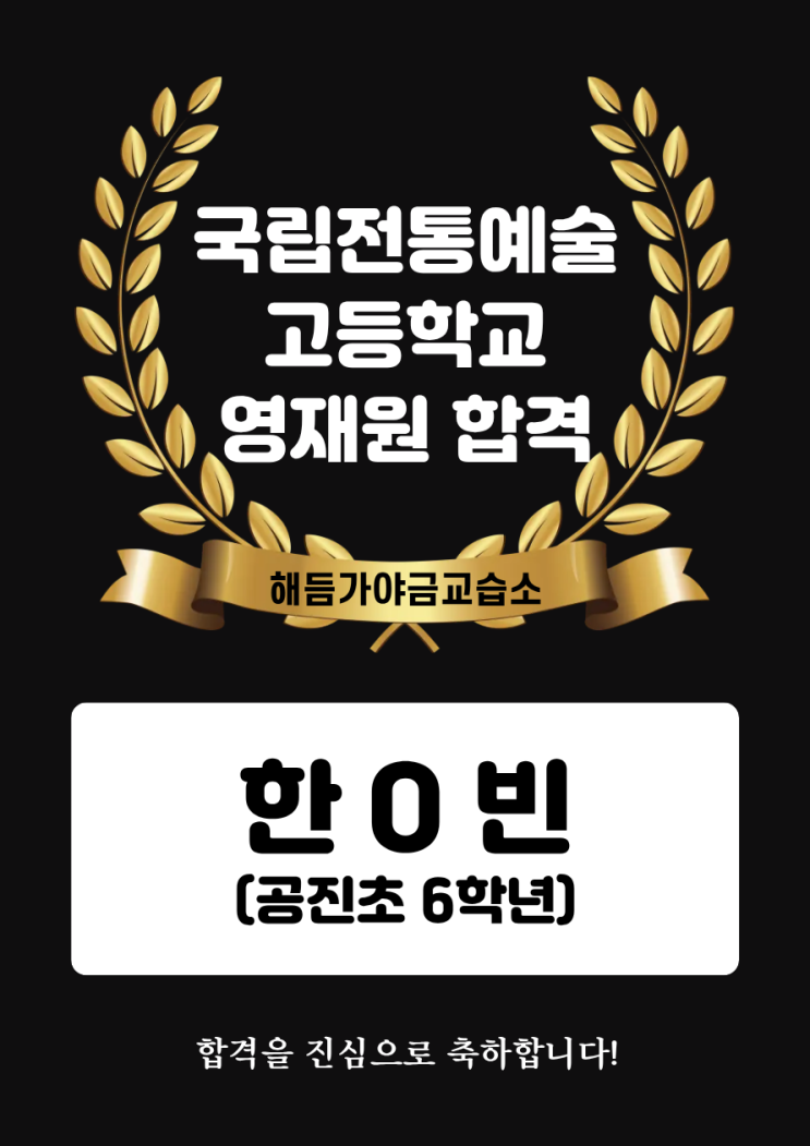 안녕하세요, 해듬 가야금입니다 ☀️ 기쁜 소식을 전해드립니다 :) 해듬 가야금 교습소 수강생이 국립전통예술고등학교 영재원에 최종 합격하였습니다. 기초부터 차근차근 다져온 시간과 학생의 꾸준한 노력, 그리고 집중력 있는 수업이 좋은 결과로 이어졌습니다 ㅎㅎ 해듬 가야금 교습소에서는 단순한 취미 수업을 넘어 입시 및 영재원 준비까지 가능한 체계적인 커리큘럼으로 지도하고 있습니다! ✔️ 개인별 수준에 맞춘 맞춤 수업 ✔️ 탄탄한 기본기 중심 지도 ✔️ 콩쿨 ・ 입시 ・ 영재원 대비 가능 학생 한 명 한명의 가능성을 발견하고 끝까지 책임감 있게 지도하는 것을 가장 중요하게 생각합니다 :) 가야금을 처음 시작하는 취미반부....... <img src="https://blogthumb.pstatic.net/MjAyNjA0MTRfMTc0/MDAxNzc2MTU1MDY2OTMy.Rd1bTIZgu_dyMUZulhCiFfmBjVOxu2avjWKcNwLdUqMg.X9Lz2Q0lSmiprkL89_AFaTQBKgWz5PvvqgleSyx8OXkg.PNG/%C1%A6%B8%F1%C0%BB_%C0%D4%B7%C2%C7%D8%C1%D6%BC%BC%BF%E4._%2813%29.png?type=s3" />