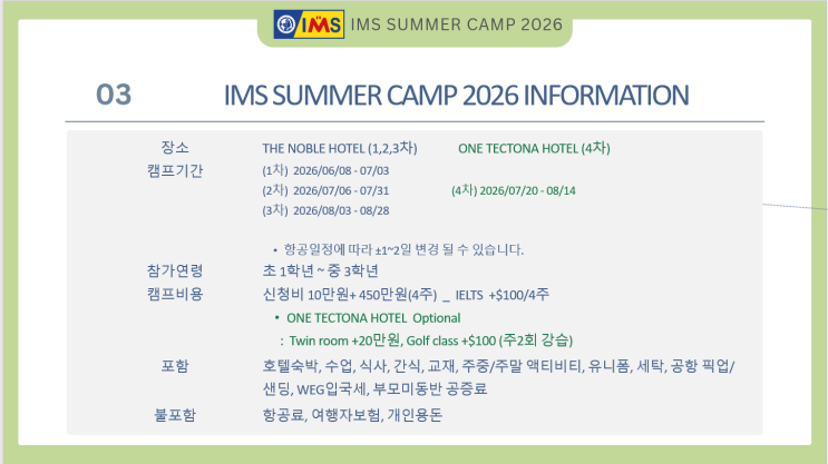 안녕하세요? 유학의 감을 잡자! 감자유학입니다. 2026년도 세부 여름 캠프 일정 소개드립니다. 오늘 안내드리는 캠프는 영어기숙사, 하루 5교시의 일대일 수업, 꼼꼼한 관리로 인지도가 높은 IMS Summer Camp 입니다. 2013년 설립된 IMS Academy는 매해 여름, 겨울 캠프를 진행하고있으며, 이번 26년도 여름캠프는 22번째의 계절캠프입니다. IMS 여름캠프는 다국적 캠프로 한국학생외에도 일본, 대만, 몽골, 베트남 등 8개국학생들이 참여하고 있습니다. 한국학생들이 많이 참여하는 캠프는 방학 일정 상 7월 20일에 시작하는 4차, 8월 3일에 시작하는 3차 캠프입니다. IMS 세부 캠프 1-3차가 진행되는 노블호텔입니다. 2+1로 선생님 한분, 학생....... <img src="https://blogthumb.pstatic.net/MjAyNjA0MTBfMTMw/MDAxNzc1ODA0OTEwNzM0.iGiGIxdg_-hFeV4HcXvbH496rU479R3QyitCNHnJdIQg.imIsCKS2yXDsiF_uWsD2tortKS2Z_FKJjAovYD5O0Dsg.PNG/26%B3%E2ims%BF%A9%B8%A7%C4%B7%C7%C1-10.png?type=s3" />