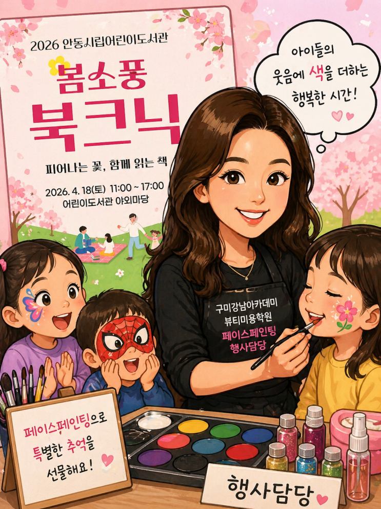 안녕하세요~ 구미강남아카데미뷰티미용학원입니다. 오늘 안동에 행사 다녀 온 소식을 전할려고 합니다~ 저희구미 강남아카데미뷰티미용학원에서는 4월18일 안동시립어린이도서관에서 진행한 봄소풍 북크닉 행사를 다녀왔습니다! 아침에 날이 우중충 해서 걱정을 많이 했지만 행사가 진행 될 수록 날이 너무 좋아졌어요! 저희 구미강남아카데미뷰티미용학원은 여러체험 부스 중 페이스 페인팅 체험을 했습니다~ 다양한캐릭터와 디자인으로 아이들에게그려주니 웃음이 끊이지 않는시간이었어요^^ 부모님들께서도 만족도가 높으셔서 행사 진행내내 반응이 정말 좋았어요^^ 아이들이 좋아하는 캐릭터, 꽃 디자인 등등으로 열심히 그려줬습니다~ 저....... <img src="https://blogthumb.pstatic.net/MjAyNjA0MjdfMjQw/MDAxNzc3MjkzODU5NzU4.2LeYO4q2jM4sq9cDZwl58IZidDFCdRFjf4e-Rzlbi10g.-8mp4zYwDJ7326qlIBsmMmoBy-NJzkVVH-pdllKgpPAg.PNG/KakaoTalk_20260427_213800334.png?type=s3" />
