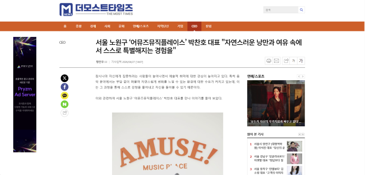 안녕하세요, 어뮤즈뮤직플레이스 원장 박찬호입니다. 이번에 더모스트타임즈와 두 번째 인터뷰를 진행하게 되었습니다. 작년 1월 첫 인터뷰 이후, 이번에는 어뮤즈가 추구하는 방향과 ‘공간의 의미’에 대해 더 깊이 돌아보고 점검할 수 있는 시간이었습니다. 앞으로도 더 나은 방향으로 성장하고, 의미 있는 변화를 만들어갈 수 있도록 노력하겠습니다. 감사합니다! 잠시나마 자신에게 집중하려는 사람들이 늘어나면서 예술적 취미에 대한 관심이 높아지고 있다. 특히 음악 분야에서는 부담 없이 머물며 자연스럽게 변화를 느낄 수 있는 환경에 대한 수요가 커지고 있는데, 이는 그 과정을 통해 스스로 감정을 풀어내고 자신을 돌아볼 수 있기....... <img src="https://blogthumb.pstatic.net/MjAyNjA0MjhfMjgx/MDAxNzc3MzU1Mjg2NDMx.nW3IBxll0l7cjCFtyzGxtbNlMfiSzlu7pF1X08Fgmzgg._aYWq5U24u1Cdkri1KxlD6gEd358AlJpSayU2DecVA0g.PNG/%C8%AD%B8%E9_%C4%B8%C3%B3_2026-04-28_144613.png?type=s3" />