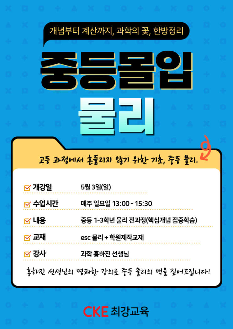홍하진 선생님의 중등 몰입 과학 <물리> 파트 5월 3일(일) 개강 매주 일요일 13:00 - 15:30 과학의 꽃이자 많은 학생들이 가장 어려워 하는 <물리>파트! 중등 물리를 제대로 잡아야 고등 통합 과학과 물리Ⅰ에서 흔들리지 않습니다. 물리는 단순한 암기 과목이 아닙니다. 원리를 이해하지 못하면 학년이 올라갈수록 격차가 벌어집니다. 과학 성적의 발목을 잡는 물리, 개념부터 계산까지 한 번에 정리합니다. 홍하진 선생님의 명쾌한 강의로 중등 물리의 맥을 짚어드립니다. 상담문의 02-823-8976 010-9943-8976 <img src="https://blogthumb.pstatic.net/MjAyNjA0MjdfMjMy/MDAxNzc3MjczOTMzNTI3.N9EKZTiZFk_v5K8tbUKNSwLZqnPJdSAQR2l2nDDz3QYg.e37IinGYHvlDhSivHVmEXXNmEYUC0_dzOC_FqlRywuIg.PNG/%C1%DF%B5%EE_%B8%F4%C0%D4_%B9%B0%B8%AE.png?type=s3" />