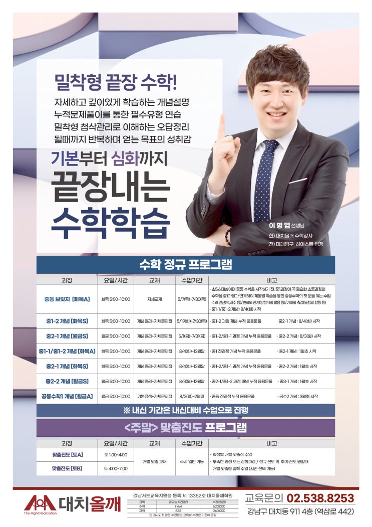 [대치올깨학원] ♥ 채움&끝장 이병엽T의 [중등 브릿지 수학] [중2-1]반 신규 모집합니다 ♥ 이병엽T의 수학 수업 프로세스_ ‘밀착형 끝장수학!’ 1. 몰입+끝장 학습으로 목표달성 ▶ 수업시간 방해요소 제거를 통하여 학습의 몰입도를 높이고 일일목표(개념노트+TEST오답 및 오답유사) 완성을 통한 성취감 획득. 일일목표 완성도 70% 미만시 끝장학습 또는 보충학습 진행 2. 스스로 개념노트 작성 + 개념 채움TEST ▶ 배운 개념의 개념노트를 작성하고, 지난시간에 배운 개념에 대하여 개념 채움TEST실시. 미통과시 다음시간 통과할 때까지 재시험. (매 TEST결과 발송) 3. 누적TEST, 대단원TEST ▶ 누적과정과 개념과정의 누적TEST 진행 후....... <img src="https://blogthumb.pstatic.net/MjAyNjA0MjVfMTg1/MDAxNzc3MDkzOTM1MjE2.TPt5G5PPVZhmcAydbv2ZJjJ71rkxw4fvKKZDXYxCIJkg.zM2cRij6Q1Onmuq7adudZVUFQfQF7IE_4zq6mswMl7sg.JPEG/2605_%B4%EB%C4%A1%BF%C3%B1%FA_%B0%AD%BB%E7%C1%F8%BE%C8%B3%BB-%C0%CC%B9%CC%C1%F6-6.jpg?type=s3" />