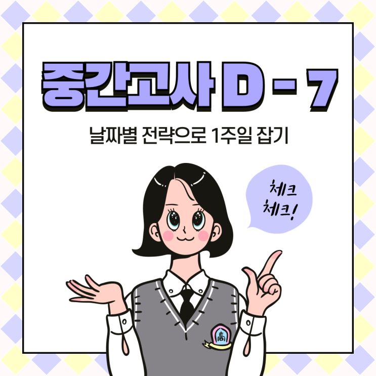 시험이 딱 일주일 남았습니다. 이 시기가 되면 아이들 표정이 두 가지로 나뉘더라고요. "이제 어떡하지?" 하며 불안해하는 아이, "뭘 해야 할지 모르겠어서 그냥 멍하니 앉아 있는" 아이. 사실 둘 다 마음은 같아요. 방향이 없으면 몸이 안 움직이거든요. 오늘은 D-7부터 D-1까지, 날짜별로 뭘 해야 하는지 딱 짚어드릴게요. D-7 ~ D-5: 범위 확인이 먼저입니다 제일 먼저 할 일은 교과서랑 학교 프린트물을 꺼내서 시험 범위를 눈으로 확인하는 거예요. 이게 별거 아닌 것 같아 보여도 학원에서 보면 이 단계를 건너뛰는 아이들이 꽤 됩니다. '3단원까지'라고 알고 있었는데 막상 3단원 절반까지만 배운 경우도 있....... <img src="https://blogthumb.pstatic.net/MjAyNjA0MTlfMTcg/MDAxNzc2NTgxODE4NTE3.stmSfDrIoZ_bpds0hqYJ6T00qtoNRcXgh10igemI4cAg.amXgQ4zsQwAiTC7ELTKHjbsQCltTD7ewdRqyLsCg2d0g.PNG/001.png?type=s3" />