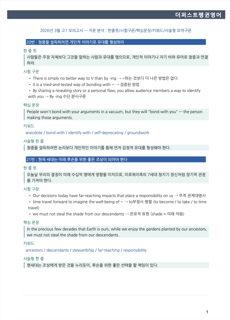 2026년 3월 고1 모의고사 영어 분석본 : 핵심문장/키워드/서술형대비: 진관동 더퍼스트펭귄 영어