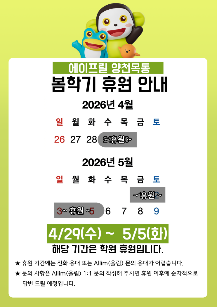 안녕하세요. 양천목동 에이프릴 어학원입니다. 4/29(수) ~ 5/5(화) ★해당 기간은 학원 휴원입니다.★ 휴원 기간에는 전화 응대 또는 올림 문의 응대가 어렵습니다. 문의 사항은 올림 1:1 문의 남겨주시면 휴원 이후에 순차적으로 답변 드릴 예정입니다. <img src="https://blogthumb.pstatic.net/MjAyNjA0MjFfMjg1/MDAxNzc2NzQxMzYwMTA5.JTAKLVBwtLUNt-ljmoObyAK5a3eyMdvnN2Ag678eNlQg.nER0gxa0EfVtLcvjYQ3iQuO42fjPszrayPcbbxSrgewg.PNG/%C8%DE%BF%F8%BE%C8%B3%BB%B9%AE_%BA%B9%BB%E7.png?type=s3" />