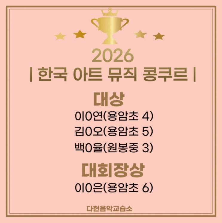 안녕하세요 청주 용암동 다현음악교습소입니다. 이번에 저희 학원에서 초등 학생들과 중등(입시 준비) 학생이 피아노 콩쿨에 참가하고 돌아왔습니다. “선생님, 저 조금 떨렸는데 그래도 잘한 것 같아요!” 이 말을 듣는데 괜히 더 뿌듯한 순간이었습니다 준비 과정이 쉽지는 않았지만, 무대를 마치고 난 뒤 아이들 표정이 정말 많이 달라졌어요. 처음 콩쿨 준비를 시작했을 때, 초등 학생들은 긴장감 때문에 속도가 흔들리기도 하고 중등 입시생은 완성도에 대한 부담이 있는 상태였어요. 그래서 단순히 곡 연습만 하기보다 무대 중심으로 연습을 진행했습니다. 한 번에 끊지 않고 연주하기, 실제처럼 긴장감을 주고 연주하기 등 영상....... <img src="https://blogthumb.pstatic.net/MjAyNjA0MTVfMjQ2/MDAxNzc2MjYyNDQxODcx.1zc9HPx5_vFXLWCGAKEIMsBacKec1ocCe_UgYO4YqcUg._EKR5PH5mmgUxNHedg-RY9mPzCrd-ZptrEgI0ecgu74g.JPEG/900%A3%DFScreenshot%A3%DF20260328%A3%DF124754%A3%DFNAVER.jpg?type=s3" />
